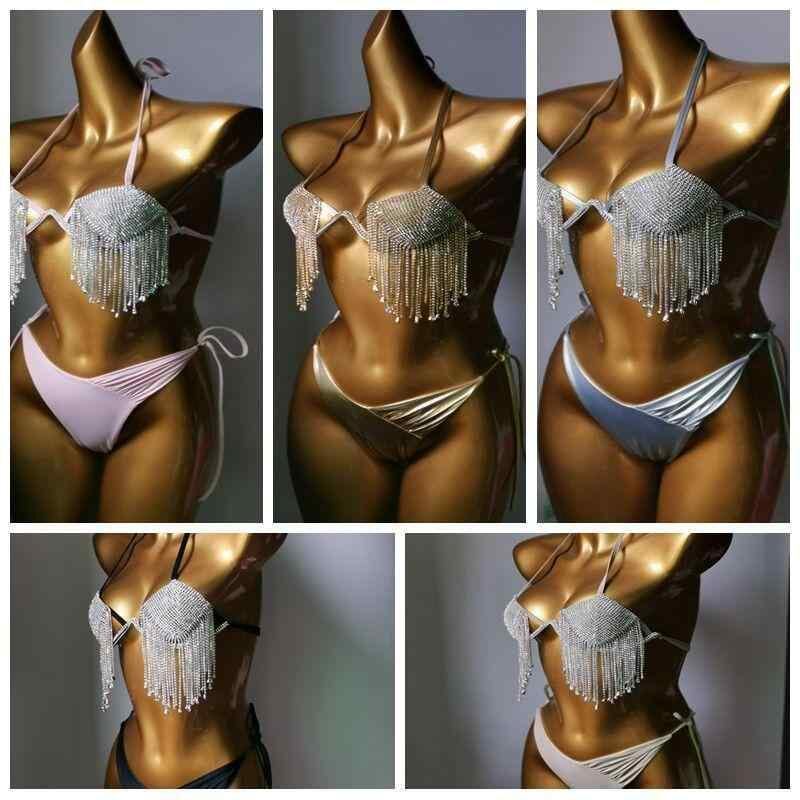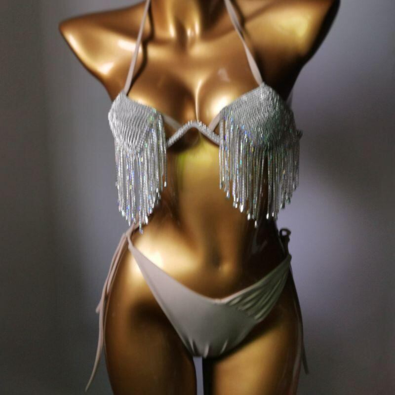 ビキニ レディース セクシー ナイトクラブ風 ワイヤー入り ハードカップ ラインストーン フリンジ ナイロン 水着 春夏 ビーチ プール リゾート 欧米風 ピンク ブラック スキンカラー