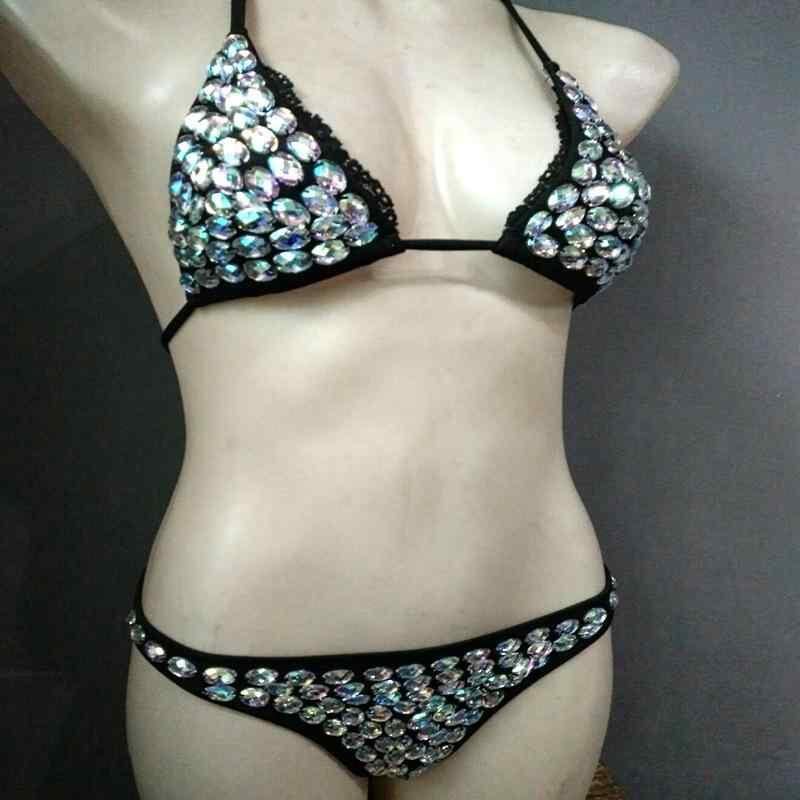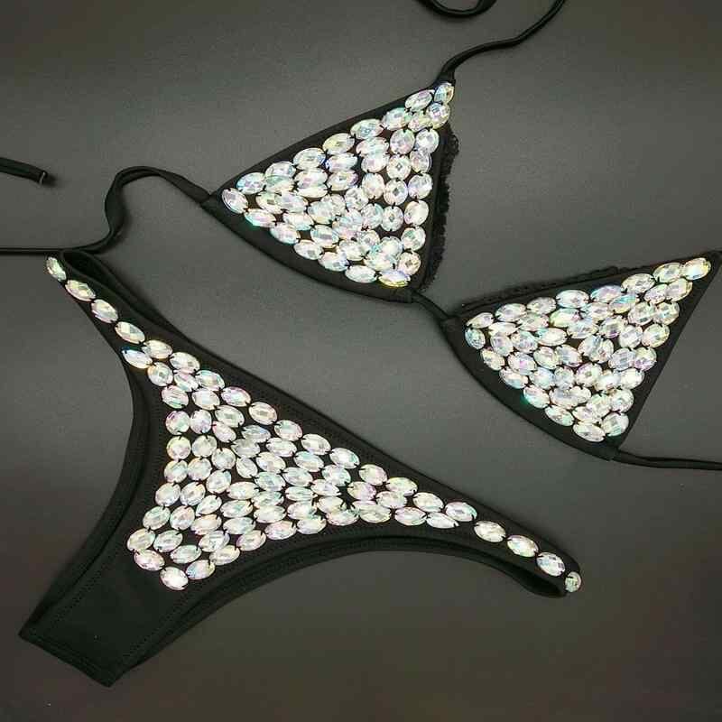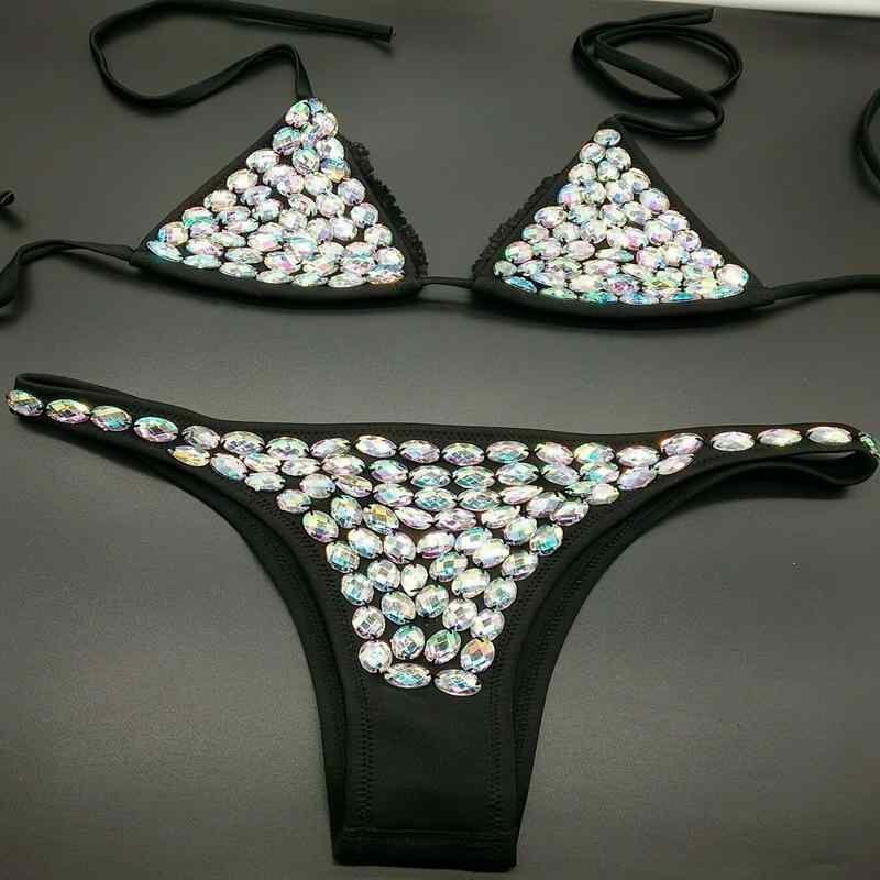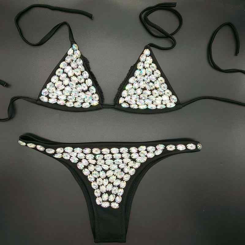 水着 レディース ネオプレン素材 再生繊維 手縫いラインストーン ビジュー ノンワイヤー ノーパッド セパレート 三角ビキニ ブラック ビーチ リゾートウェア