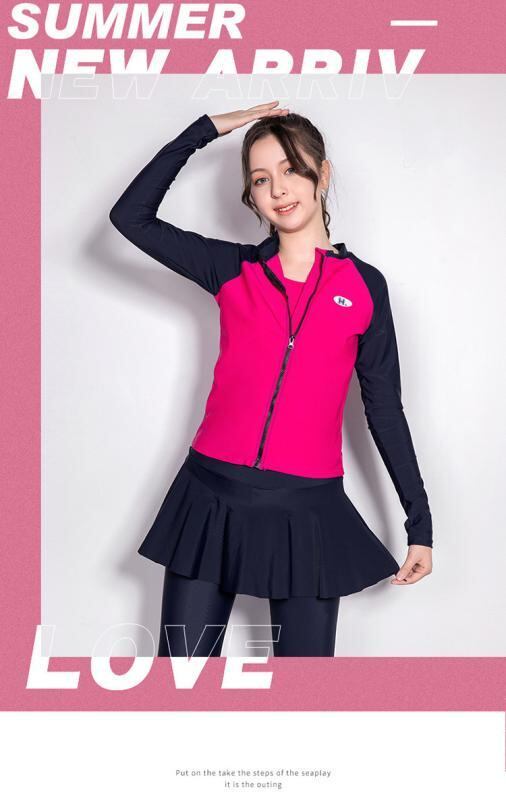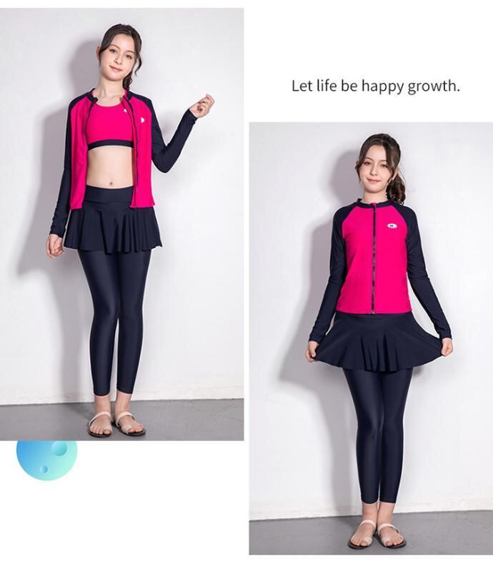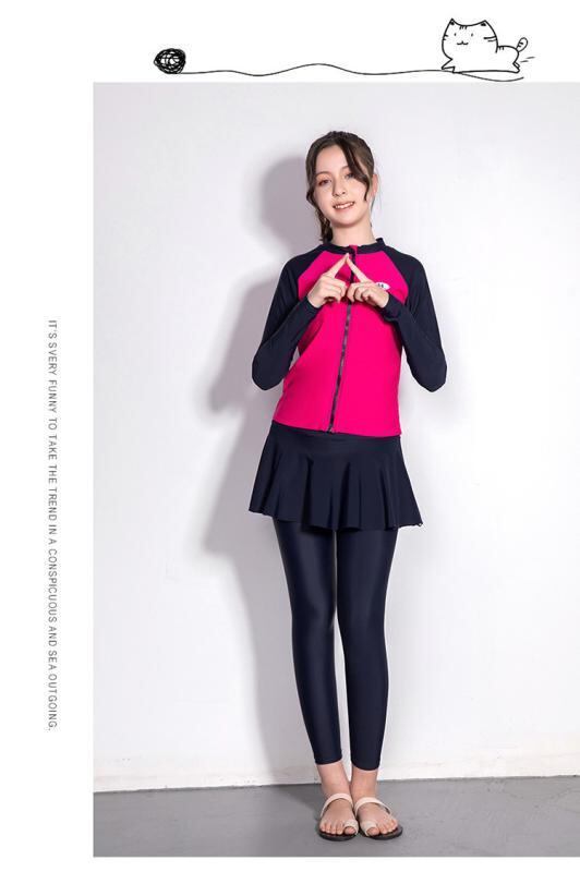 水着 子供 女の子 ジュニア 長袖 長ズボン セパレート 4点セット UV対策 日焼け防止 プール 海水浴 スイミング レジャー 無地 ナイロン ポリエステル ローズレッド