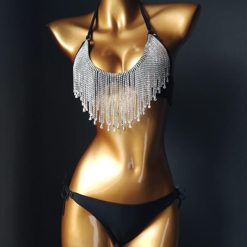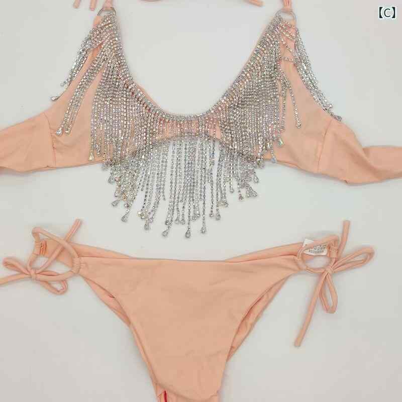 水着 レディース ラインストーン フリンジ ワイヤー入り パッド付き 三角ビキニ セクシー ゴージャス プール 海 ビーチ リゾート スイムウェア 春夏 ブラック