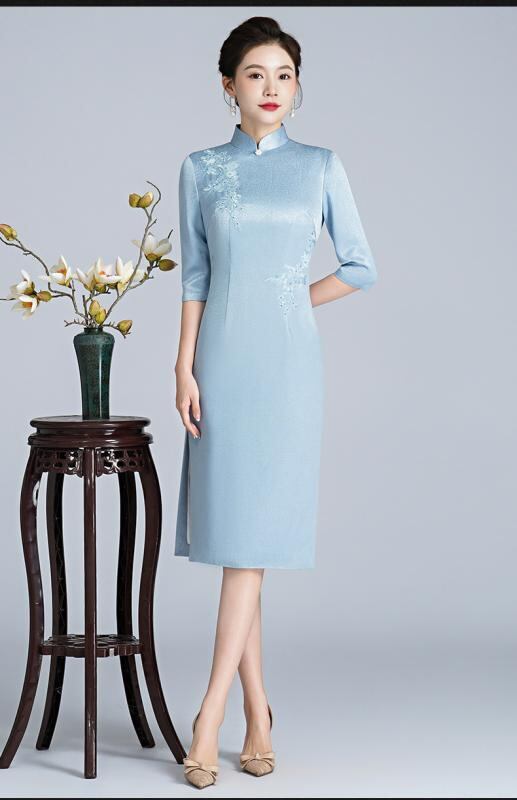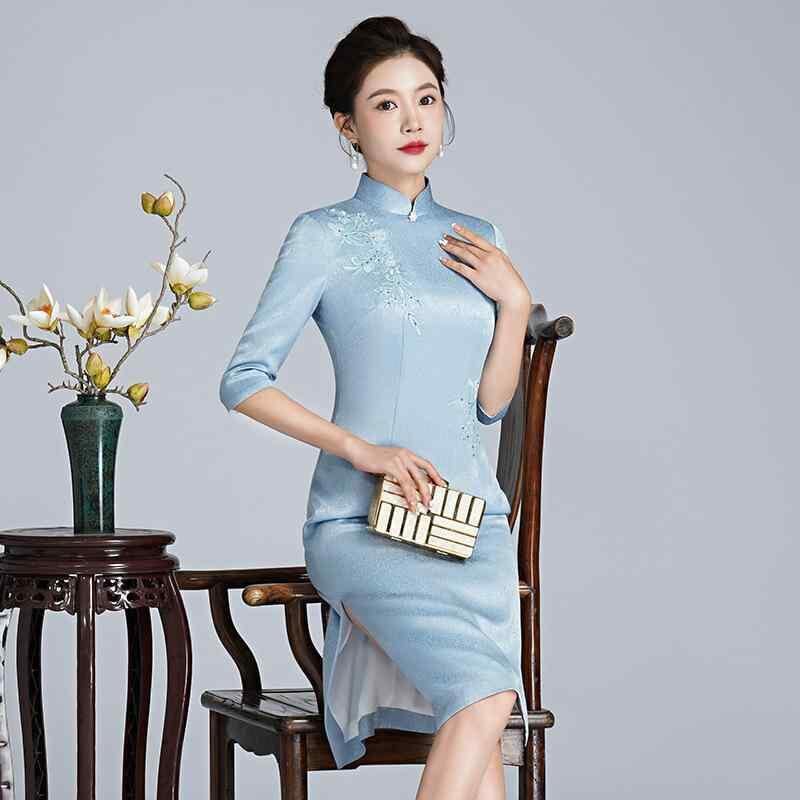 チャイナドレス レディース 若年層向け アセテートサテン ポリエステル 中国風 刺繡 改良デザイン 立体装飾 スタンドカラー 五分袖 ミドル丈 ロースリット ワンピース エレガント レトロ スカイブルー 春夏