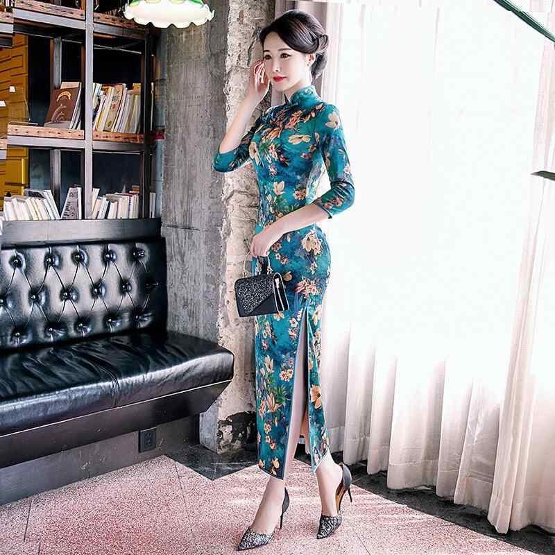 チャイナドレス レディース 桑蚕シルク ワンピース ロング丈 長袖 改良型 スリムフィット 体型カバー 中国風 レトロ 上品 中高年向け 春夏