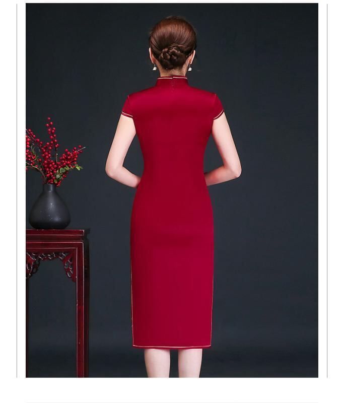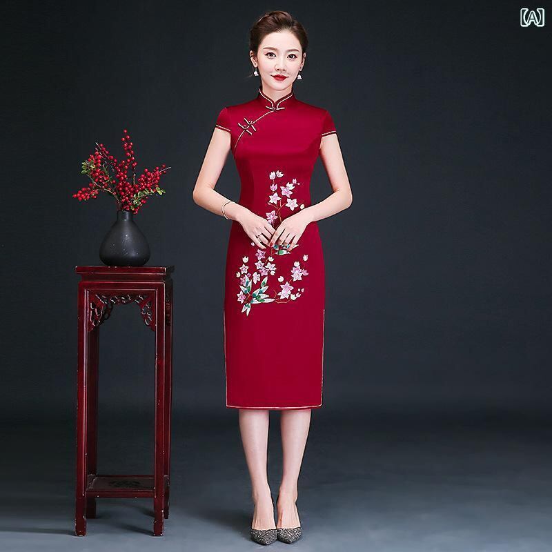 チャイナドレス ミセス 女性用 ワインレッド ボルドー スタンドカラー 半袖 刺繍 アセテート素材 大きいサイズ ゆったり 春夏 フォーマル パーティードレス 結婚式 お呼ばれ セレモニー ワンピース エレガント 上品