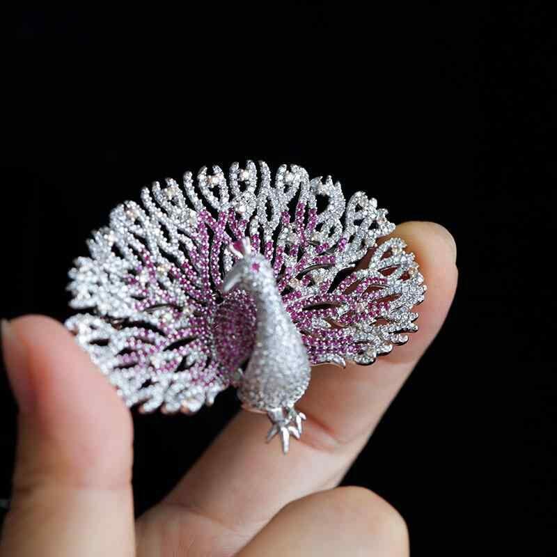 ブローチ レディース 女性用 孔雀モチーフ 欧米風 おしゃれ 華やか 高級感 キラキラ輝く ジルコニア 銅製 大ぶり 洋服 コート ドレス フォーマル パーティー レッド グリーン