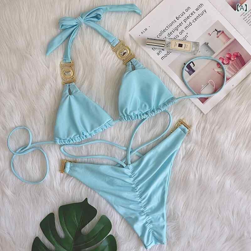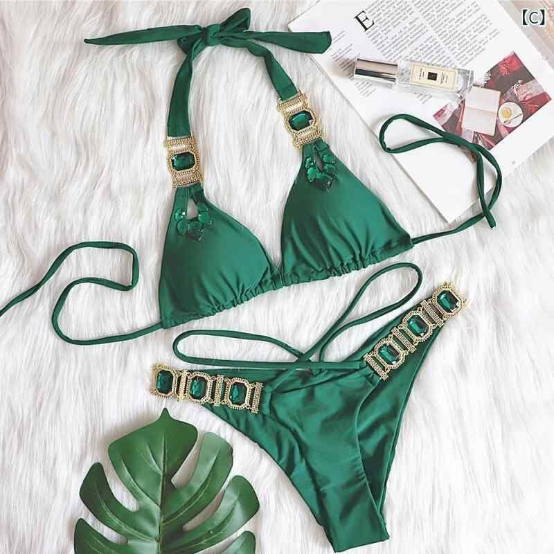 ビキニ レディース セパレート 水着 ハイウエスト バックシャン 無地 セクシー ラインストーン ストラップ ナイロン ポリエステル素材 ライトブルー ローズピンク グリーン プール ビーチ リゾート 海水浴 春夏 サマー