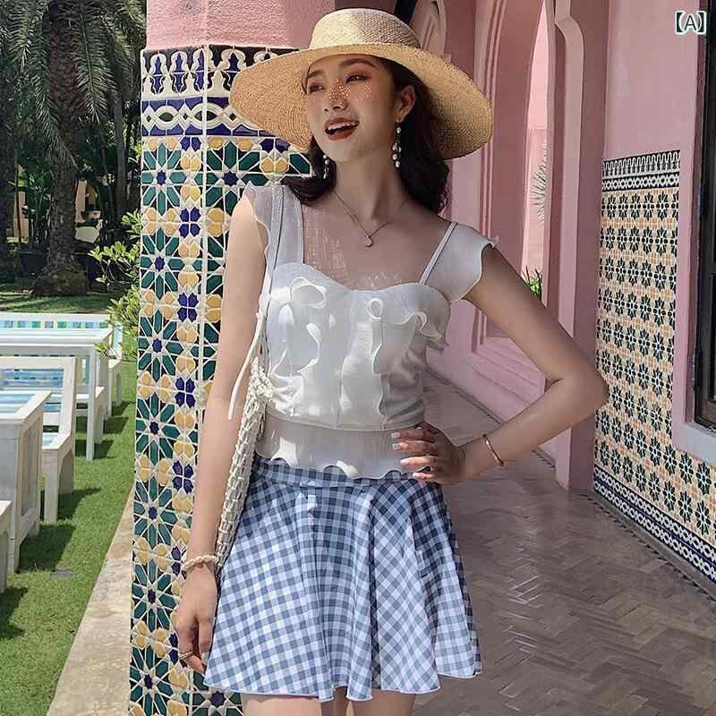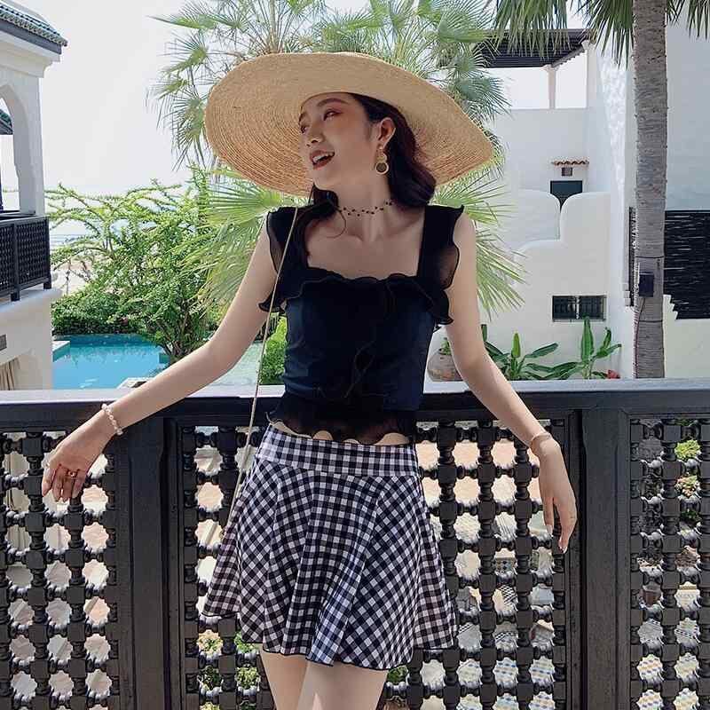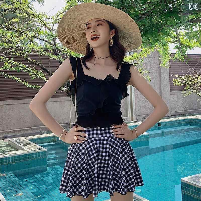 水着 レディース 韓国風 スカート セパレート フリル チェック柄 体型カバー 細見え 胸パッド付き ノンワイヤー 上品 エレガント 女子学生 リゾート プール ビーチ 夏 スイムウェア