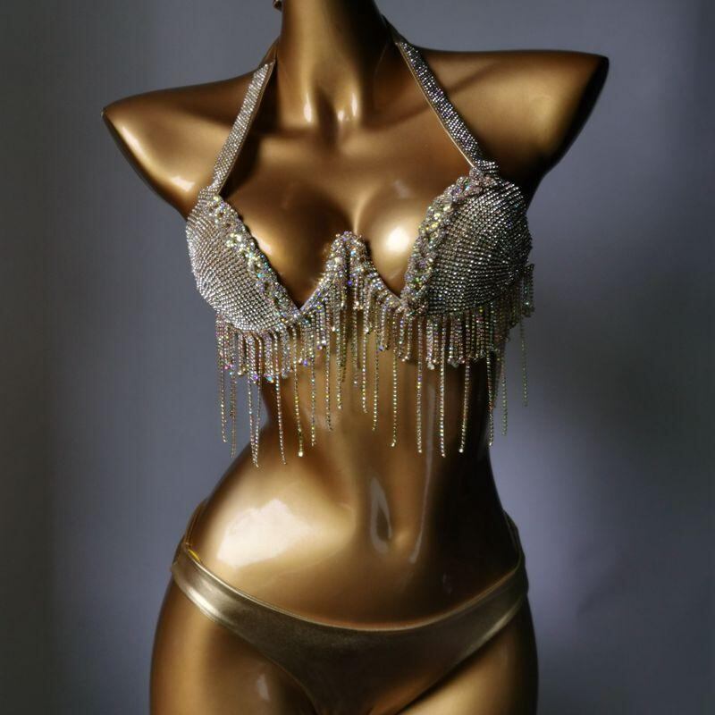 ビキニ レディース 女性用 水着 ジルコニア フリンジ カップ付き ノンワイヤー 無地 欧米風 ナイロン スパンデックス フィットネス リゾート プール ナイトクラブ イベント セクシー 夏 ピンク ゴールド シルバー ブラック
