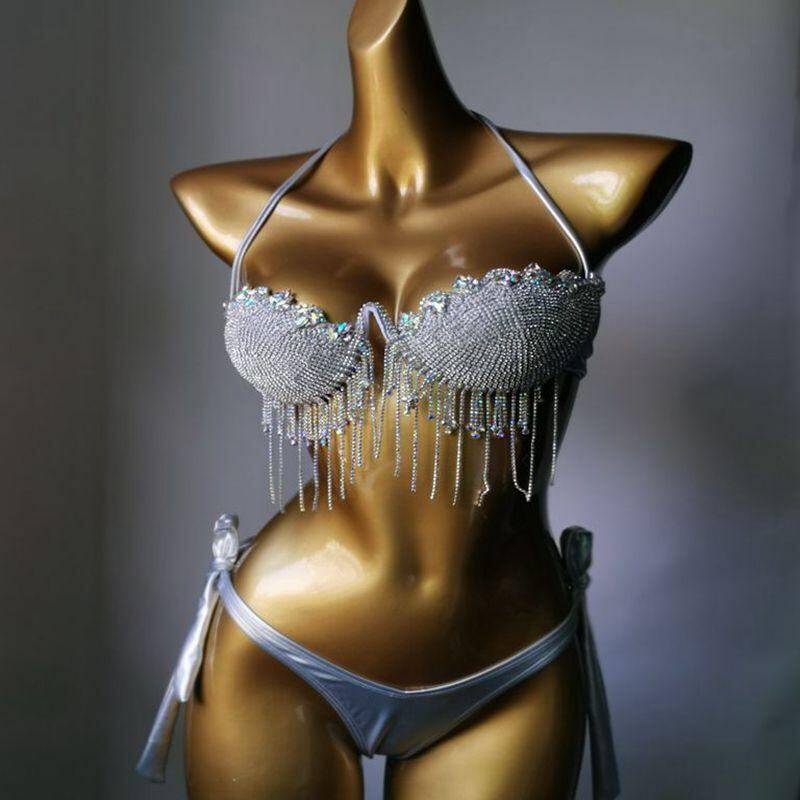 ビキニ レディース ワイヤー入り ハードカップ ラインストーン フリンジ セクシー ゴージャス ナイトプール リゾート ビーチ 海水浴 スイムウェア 春夏 ピンク ブラック