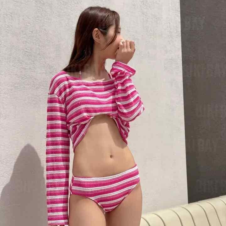 水着 レディース 韓国デザイナー セパレートビキニ 3点セット 長袖カバーアップ 配色ストライプ ハイウエスト 体型カバー パッド付き ノンワイヤー 高伸縮性 ビーチ プール リゾート 春夏 ピンク ブルー