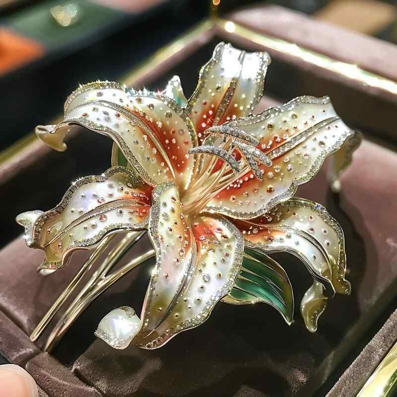 ブローチ レディース 女性用 エレガント ユリの花 モチーフ ライトラグジュアリー 輝くジルコニア 銅製 電気メッキ加工 オリジナルデザイン 秋冬 普段使い パーティー フォーマル 記念日 誕生日 ギフト