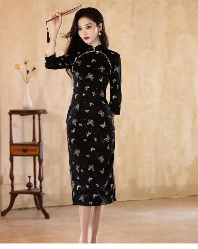 チャイナドレス レディース モダン 改良型 小柄向け スリムフィット ロング丈 7分袖 普段使い カジュアル 春夏 ポリエステル 立襟 斜め襟 ローカットスリット