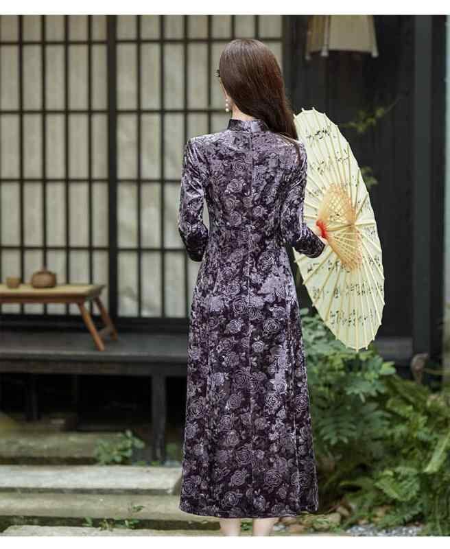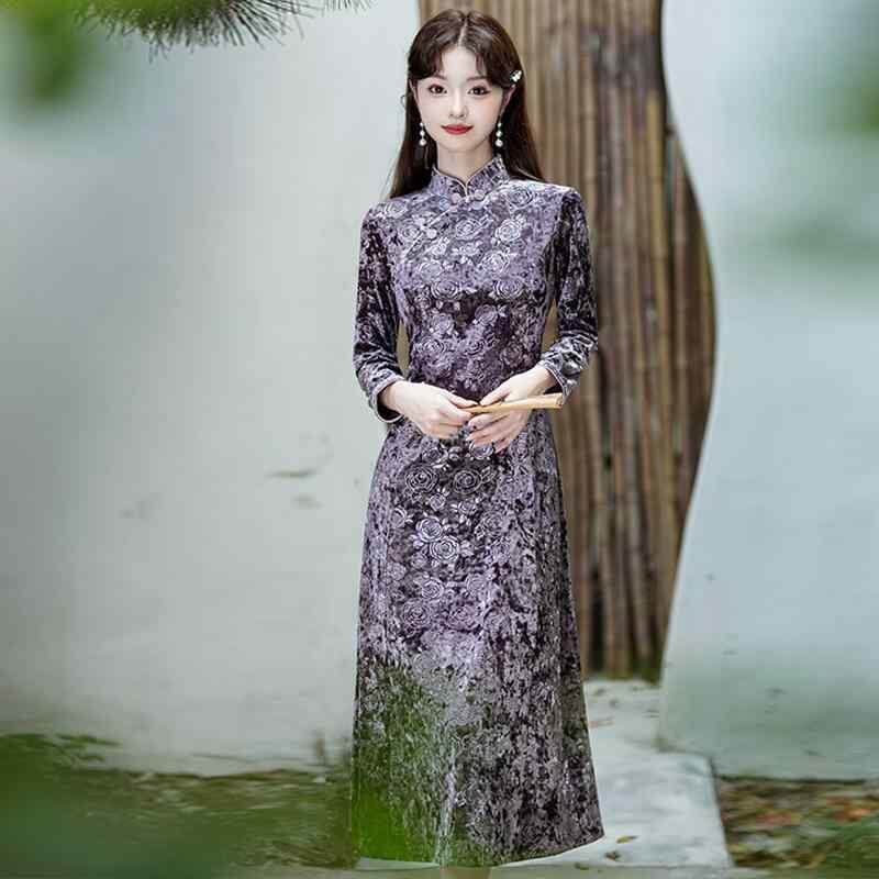 チャイナドレス レディース モダン レトロ チャイナ風 改良 ロング丈 長袖 フレアスカート 普段使い お出かけ ポリエステル素材 スタンドカラー 斜め前開き エレガント 上品 春夏 ワンピース