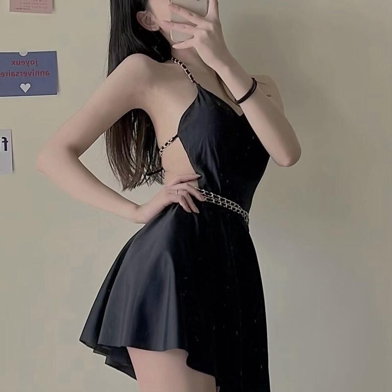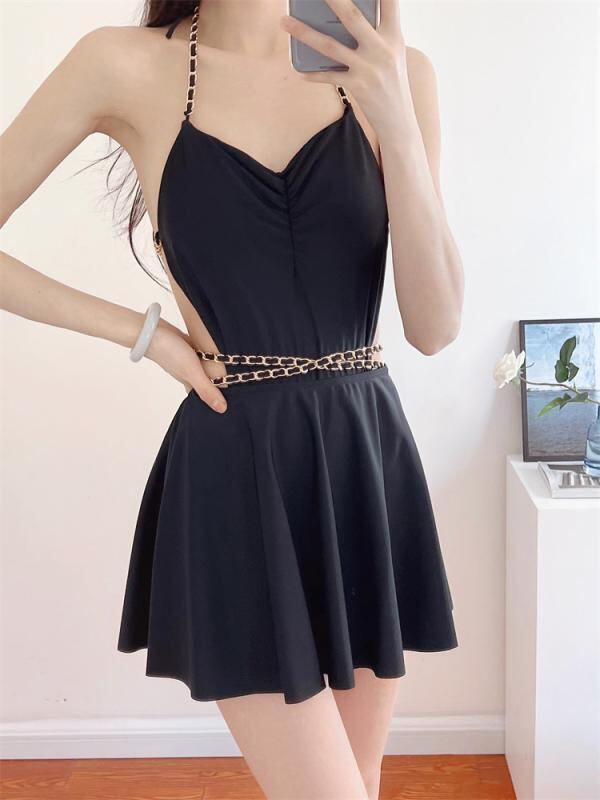 水着 レディース ワンピース水着 チェーン セクシー スイムウェア リゾート おしゃれ かわいい 背中見せ 無地 黒色