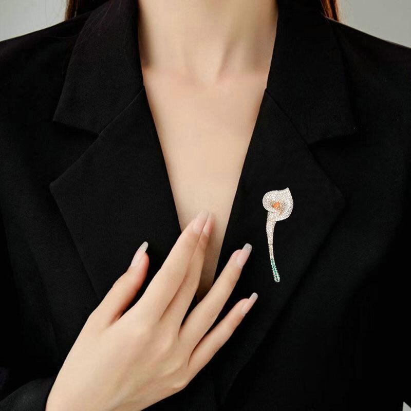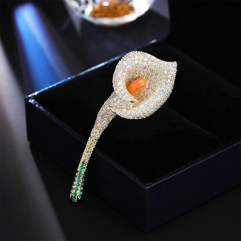 ブローチ レディース 高級感 エレガント 個性的デザイン ジルコニア装飾 カラーリリー 花型ピン スーツ フォーマル ジャケット装飾 通勤 オフィス パーティー 華やか プレゼント 金色 銅製 電気メッキ