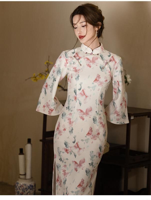 チャイナドレス レディース 小花柄 ラッパ袖 フレアスリーブ ロング丈 スタンドカラー 斜め襟 改良型 モダン 新中華風 日常使い デイリー エレガント 上品 ポリエステル 春夏