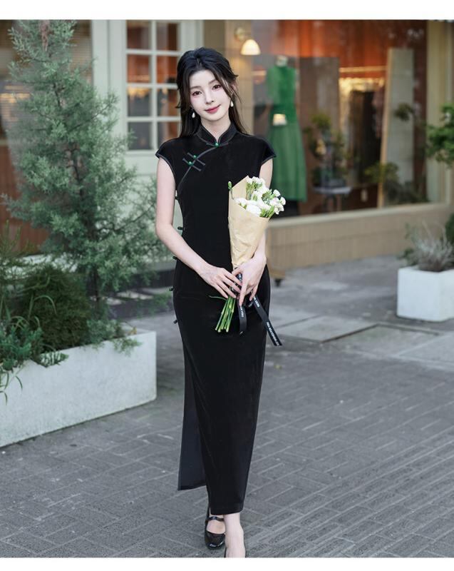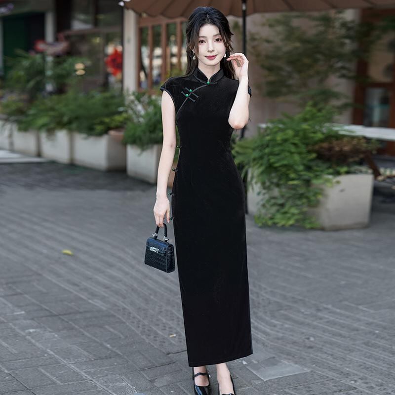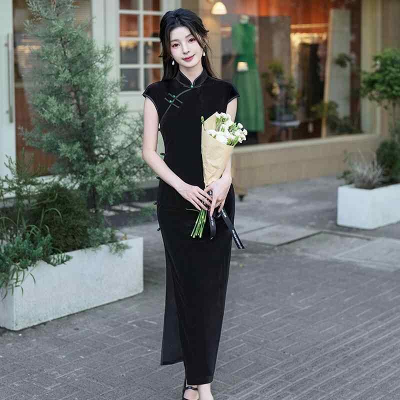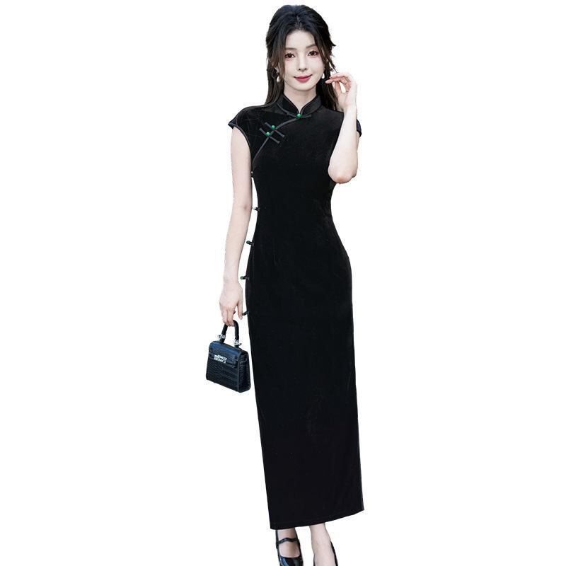 チャイナドレス レディース ブラック ロング丈 スタンドカラー ノースリーブ モダン 改良デザイン 新中華風 エレガント レトロ 普段使い ポリエステル 春夏