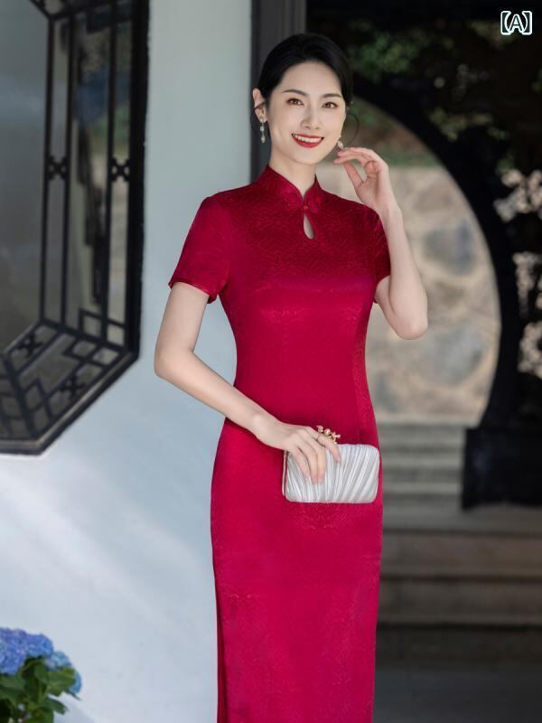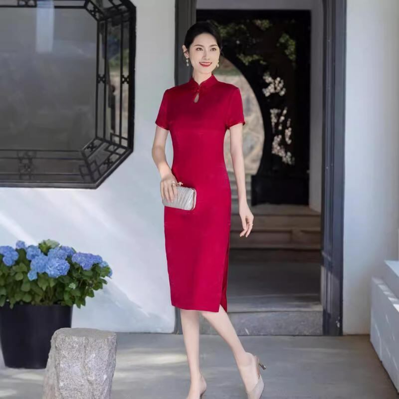チャイナドレス レディース 改良型 大きいサイズ 春夏 上品 エレガント 慶事 結婚式 フォーマル ミセス ママドレス レッド ポリエステル 伸縮性 五分袖 スタンドカラー 低スリット レトロモダン