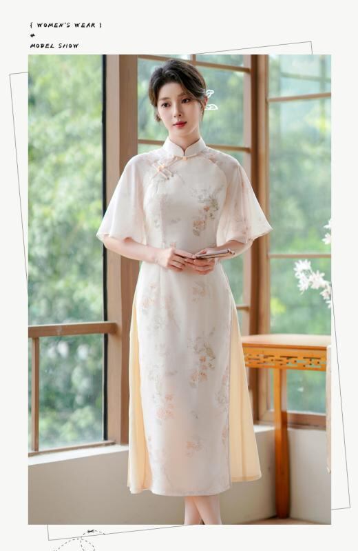 チャイナドレス レディース 改良 若者スタイル エレガント レトロ クラシカル 花柄 ジャガード織り ポリエステル スパンデックス スタンドカラー 3分袖 ハイネック ワンピース ドレス 普段使い デイリーユース イエロー 春夏