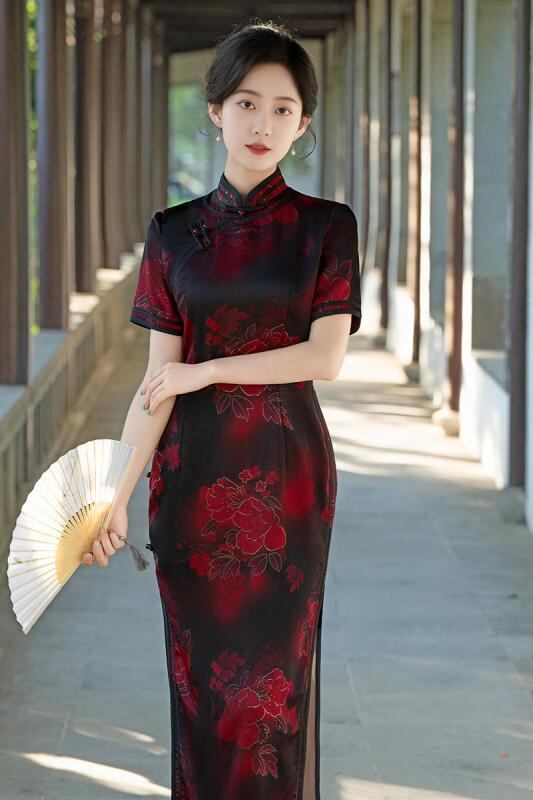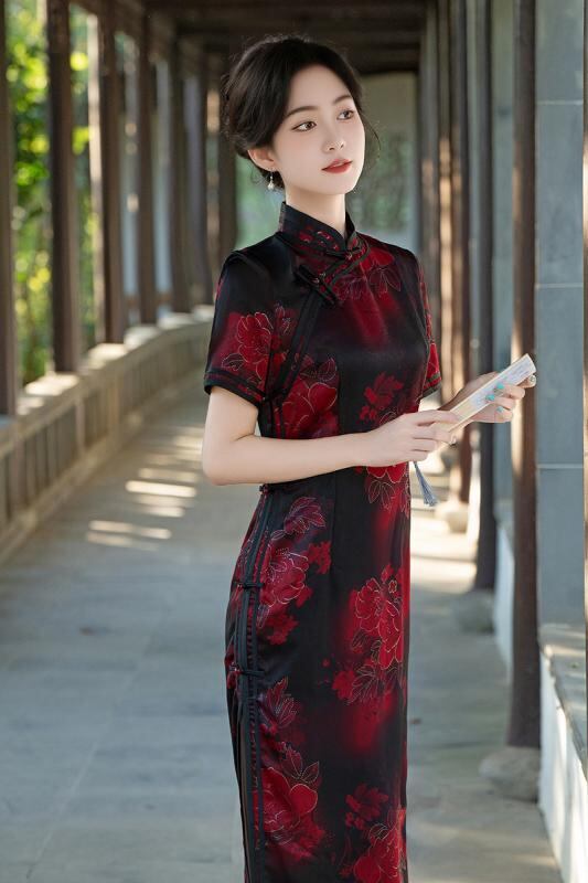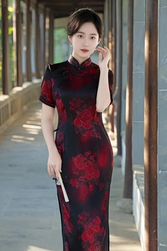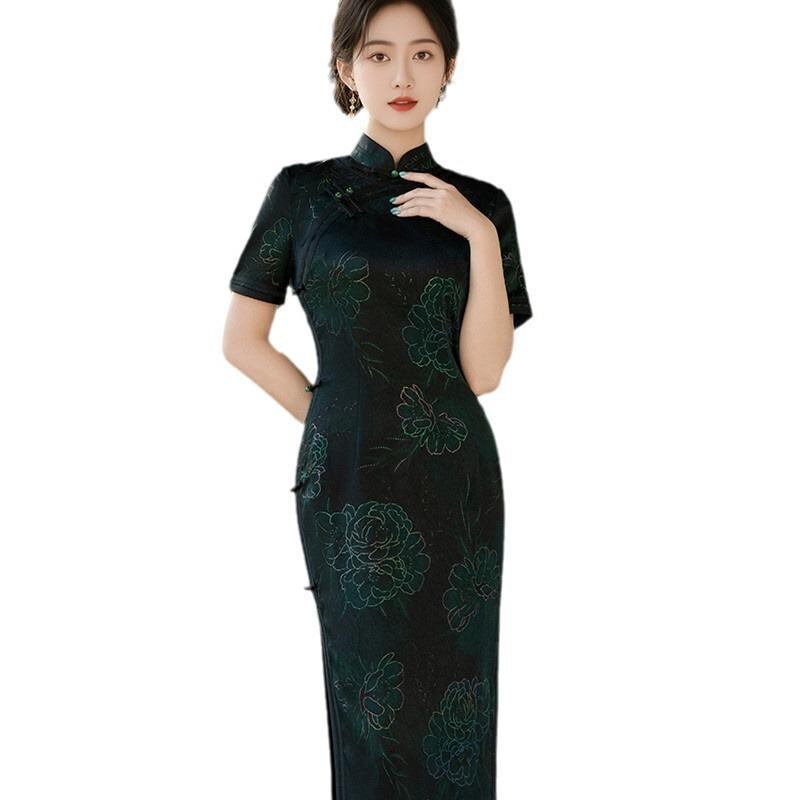 チャイナドレス レディース 大人女性 レトロ 新中華風 オールド上海風 ロング丈 黒 春夏 ポリエステル 伸縮性素材 スタンドカラー 七分袖 サイドスリット