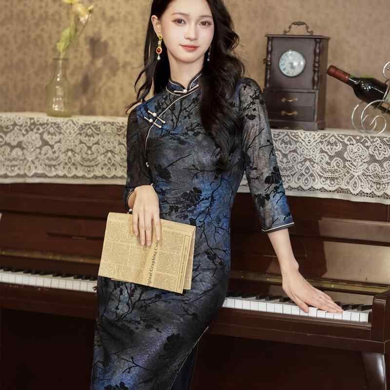 チャイナドレス レディース ミセス 中高年 ミドル丈 七分袖 レトロスタイル 普段使い ポリエステル スパンデックス 伸縮性 スタンドカラー 斜め襟 低めスリット ダークグリーン 高級感