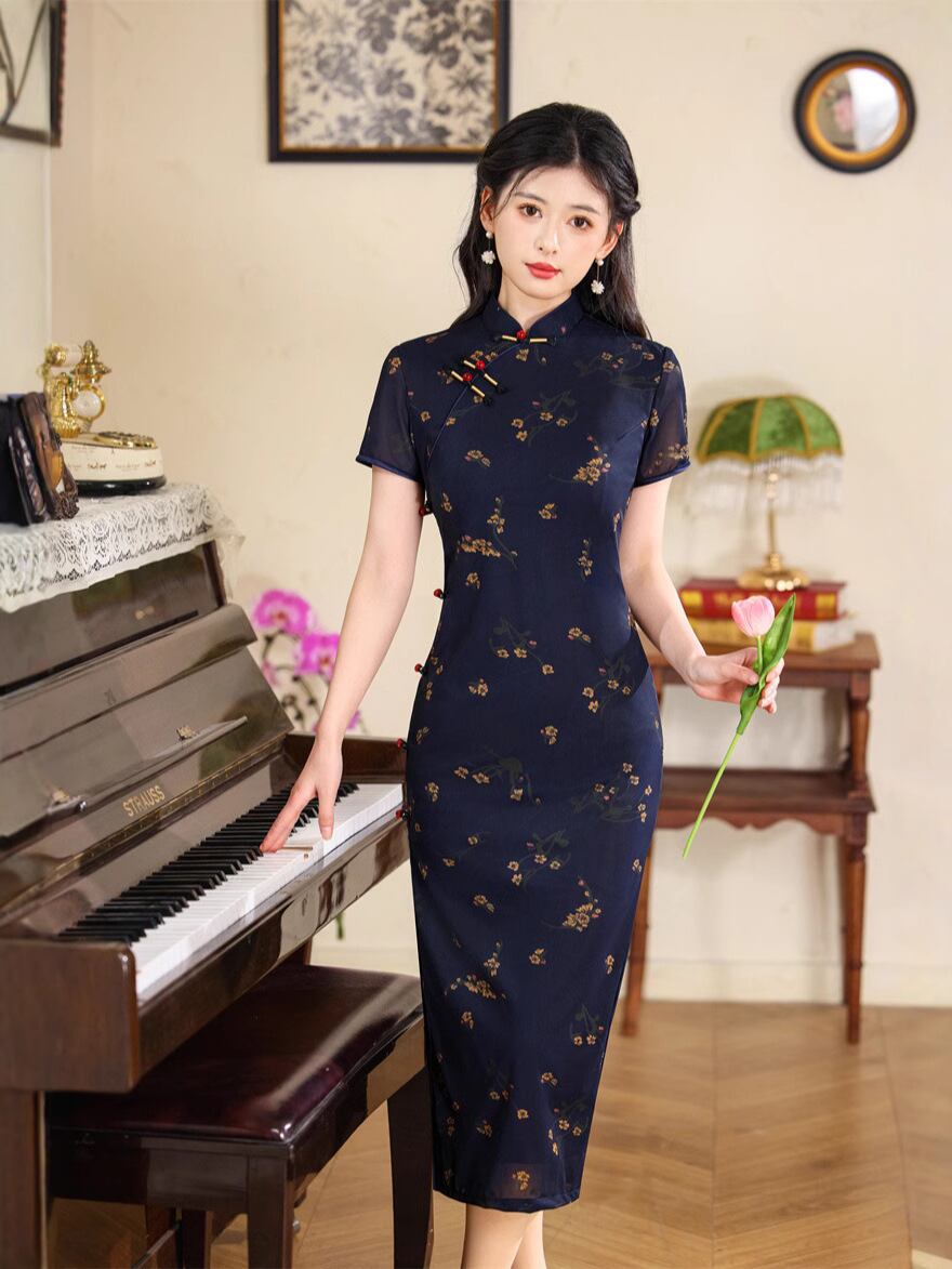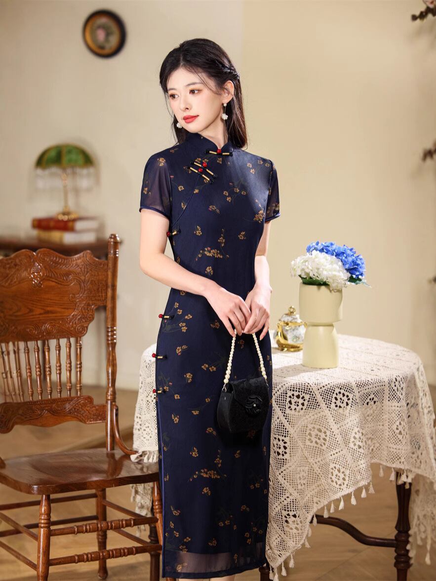 ・主な素材: ポリエステル繊維80~90%未満・丈: ロング・ネックライン: スタンドカラー・襟元: 斜め襟・袖丈: 短め・スリット: 低め・柄: 3D/立体柄・カラー展開: 紺・サイズ展開: M、L、XL、2XL、3XL・スタイル: 文芸レトロ・対象年齢: 成人・伸縮性: ややあり・対象性別: 女性・袖タイプ: レギュラー袖・加工: パイピング