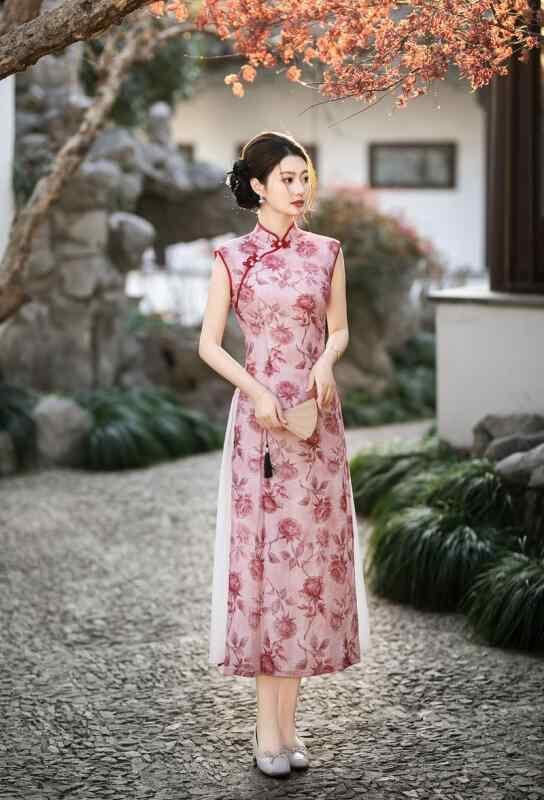 チャイナドレス レディース アオザイ 改良版 春夏 高級感 エレガント 上品 小花柄 若見え ワンピース ドレス ピンク 女性用 パーティー お呼ばれ フォーマル ロング丈