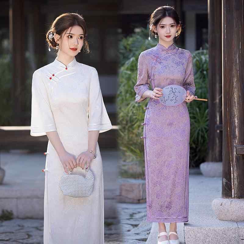 チャイナドレス レディース モダンチャイナ 上品 エレガント ロング丈 レトロ ベルスリーブ 五分袖 スタンドカラー 斜め襟 ポリエステル 伸縮性 春夏 ベージュ パープル