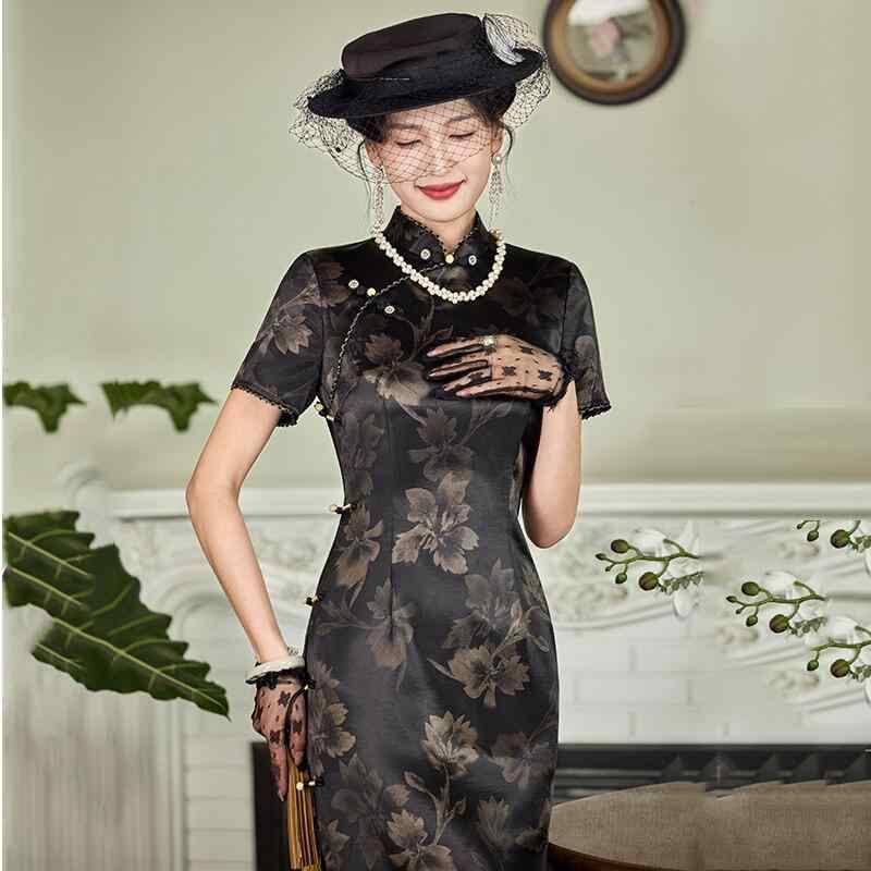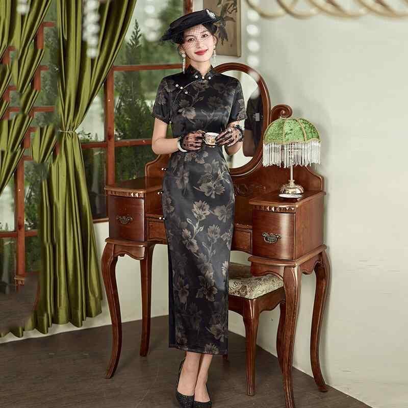 チャイナドレス レディース 高級感 黒 ロング丈 改良 レトロ オールド上海 中華風 スタンドカラー 斜め襟 七分袖 ポリエステル アセテート風 春夏