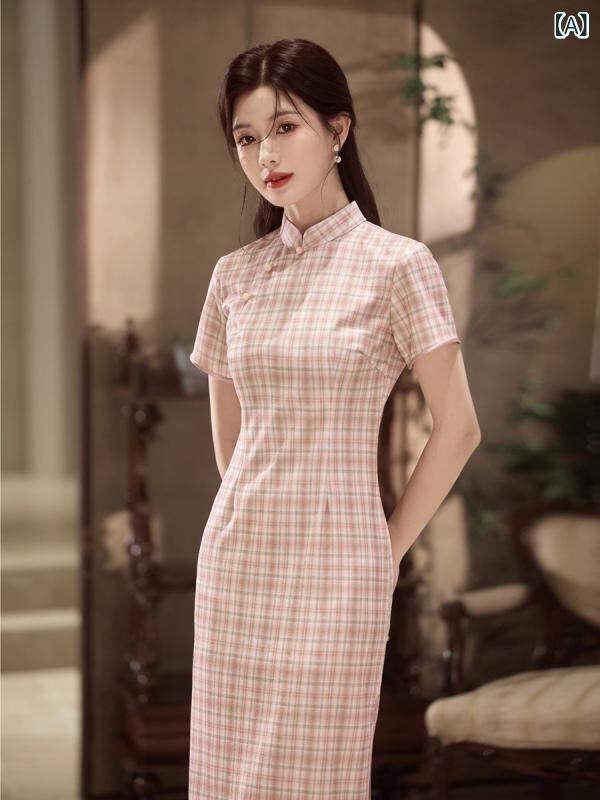 チャイナドレス レディース ワンピース 夏物 ピンク 格子柄 新中華風 向け 少女風 スクール風 レトロ