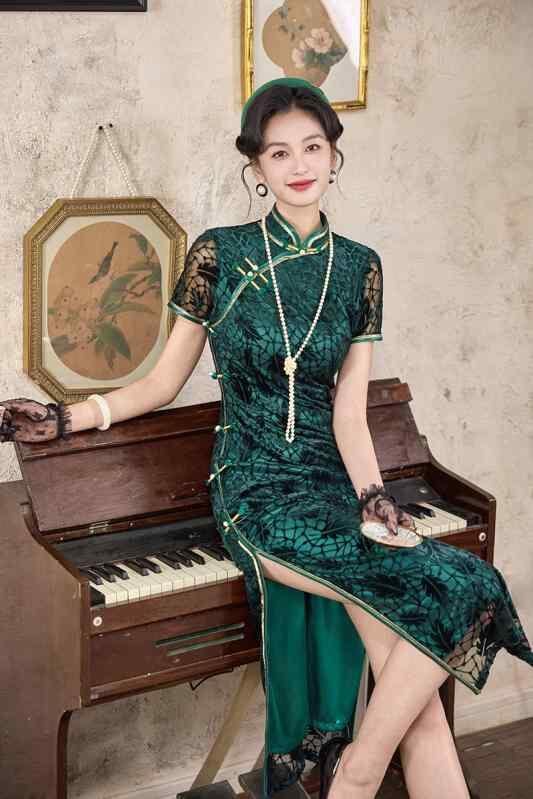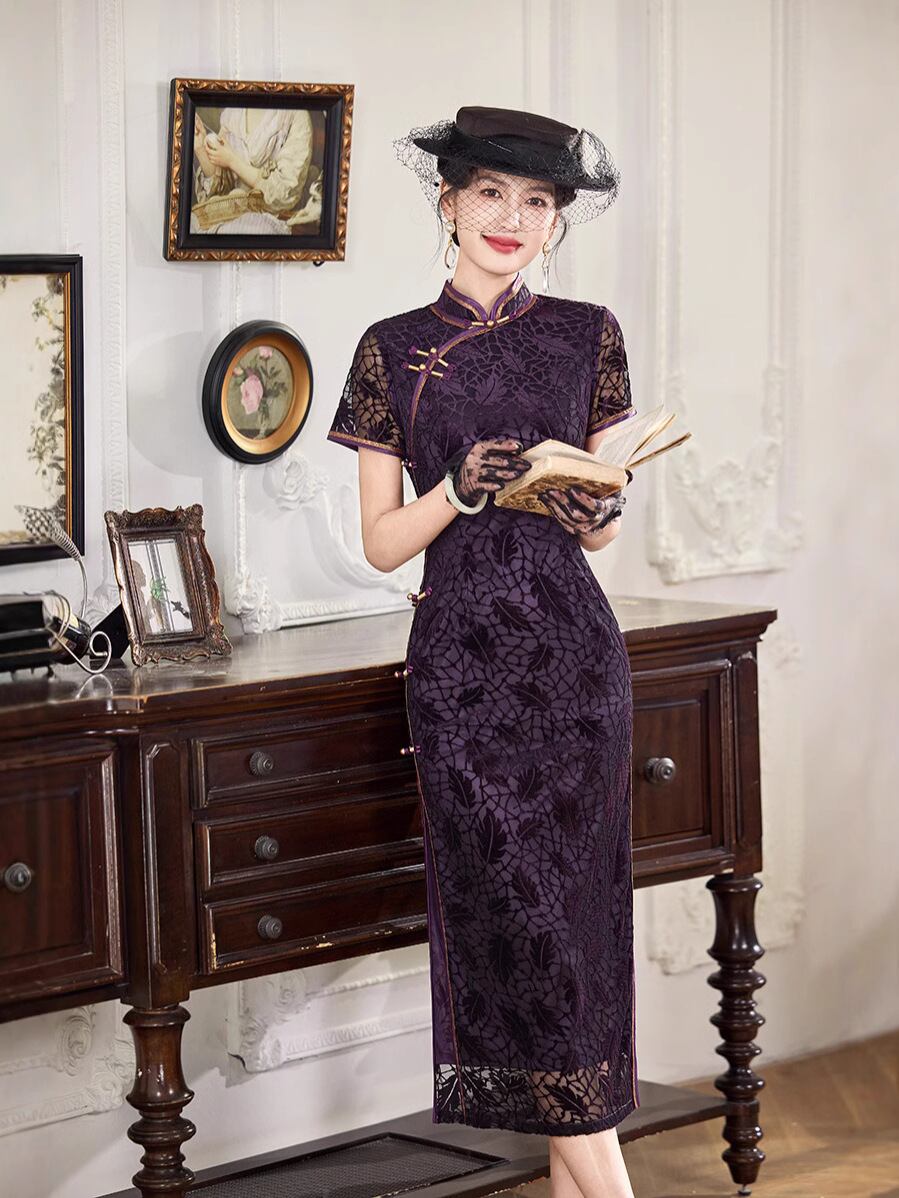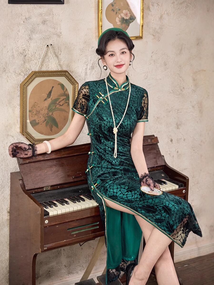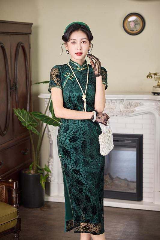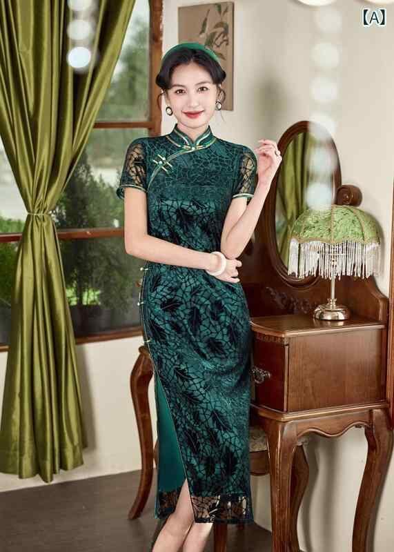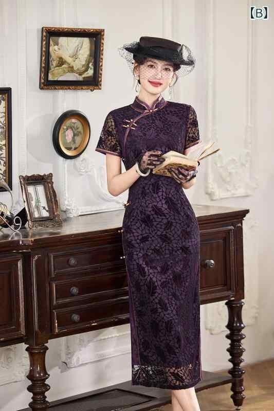 チャイナドレス レディース レトロ上海風 花柄ベルベット 細見え 改良 ロング丈 スタンドカラー 斜め襟 スリット入り 春夏 普段使い ママ ストレッチ素材 エレガント