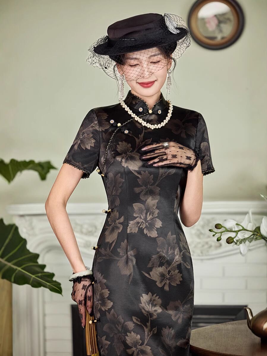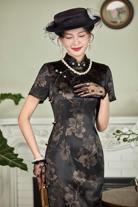 チャイナドレス レディース 春夏 光沢プリント 立体柄 高級感 スリムフィット ロング丈 立襟 五分袖 ブラック レトロ クラシカル 普段使い 伸縮性