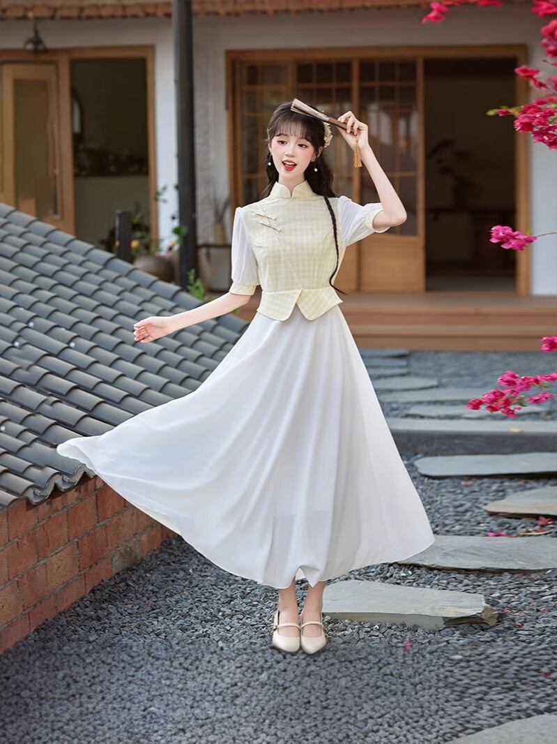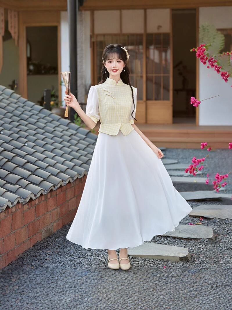 チャイナドレス レディース フェミニン スタイリッシュ 春夏 ツーピース 2点セット チェック柄 ジャカード織り スウィート 甘め ガーリー 少女風 小優雅 ファッション おしゃれ ドレス ワンピース