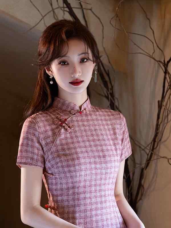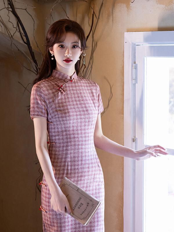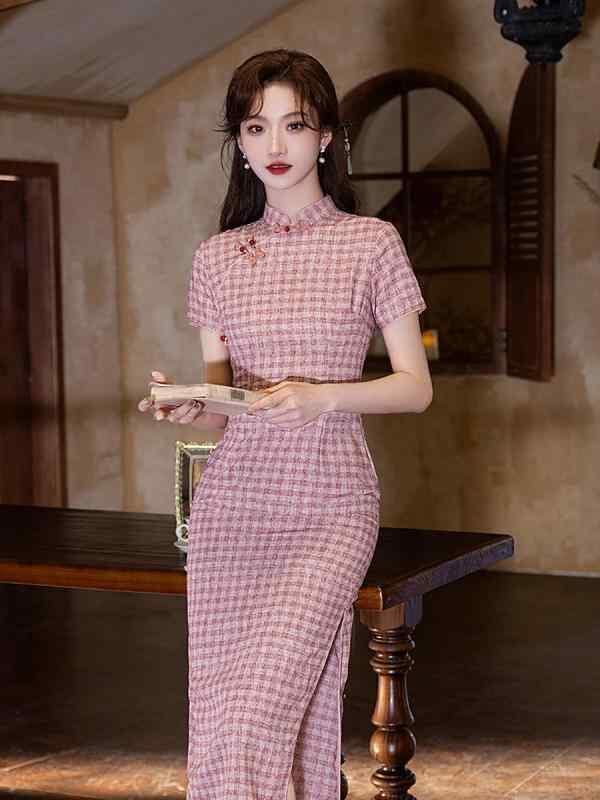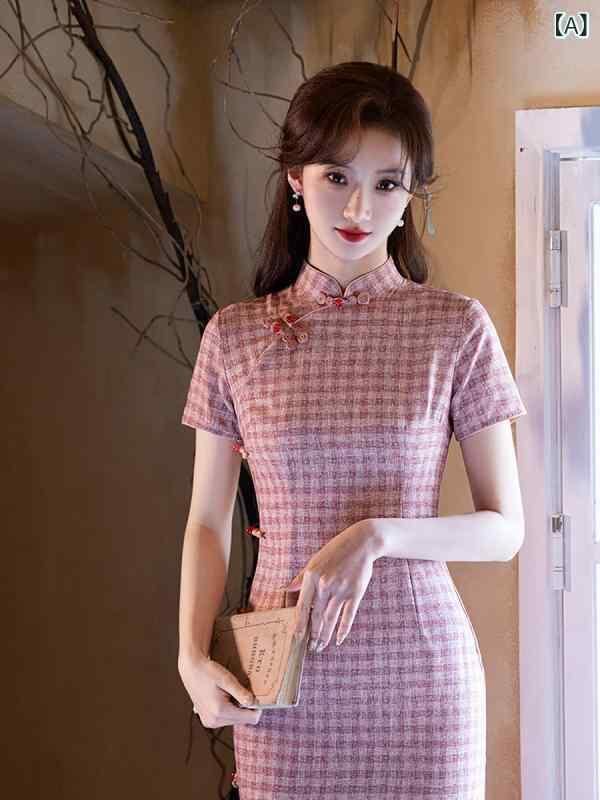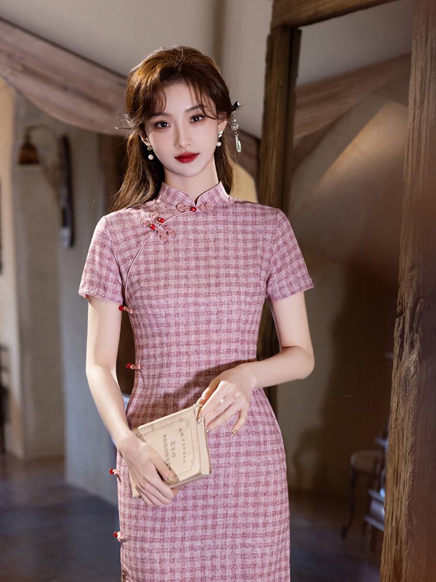 チャイナドレス レディース フェミニン スタイリッシュ ピンク チェック柄 女性用 夏用 ロング丈 少女風 若々しい女性向け レトロ 文芸調 新中華スタイル ワンピース 普段着