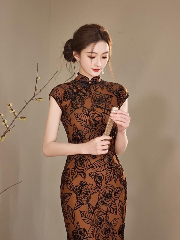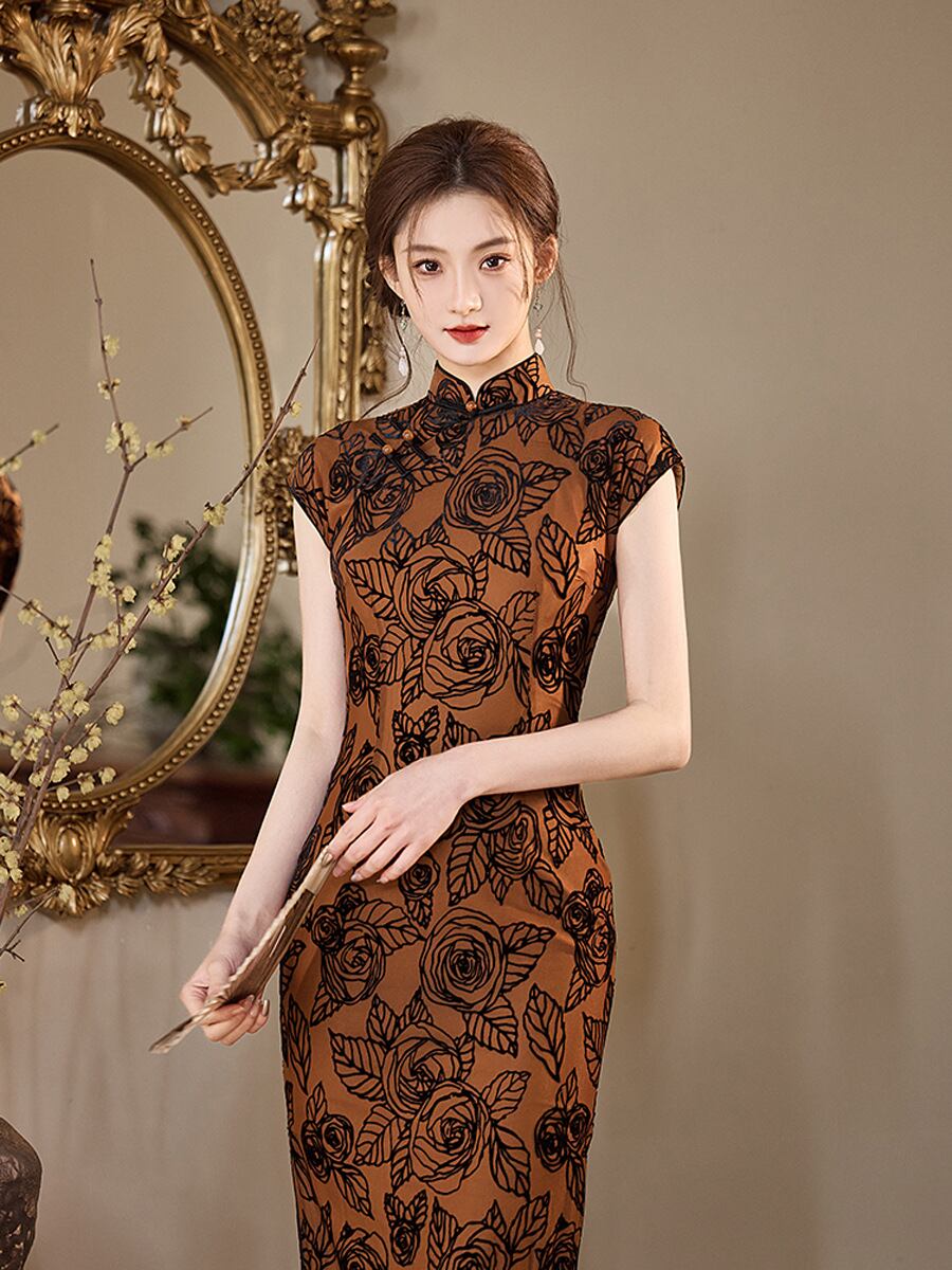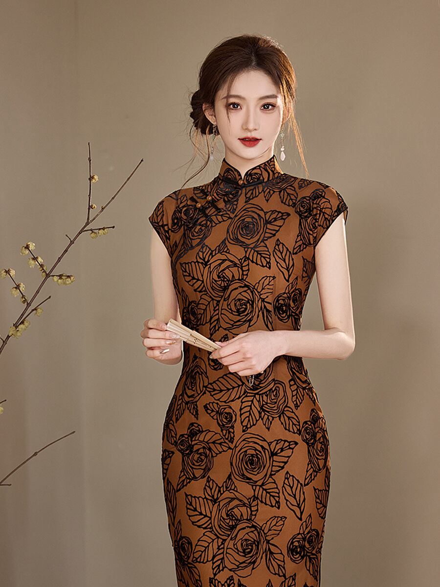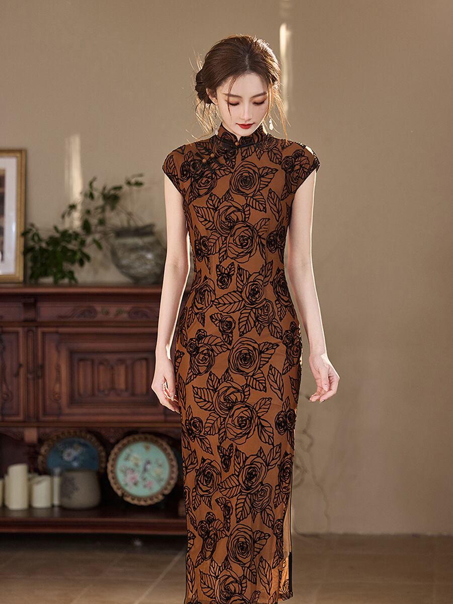 チャイナドレス レディース レトロ 香港風 新中華風 改良型 モダン 上品 エレガント 体型カバー 半開襟 スタンドカラー 斜め襟 3分袖 スリット ロング丈 ポリエステル スパンデックス 伸縮性 ダークブラウン 春夏