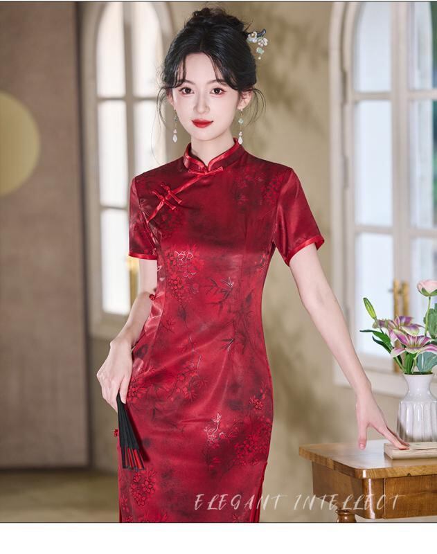チャイナドレス レディース 改良版 レトロ ファッション ロング丈 立ち襟 斜め襟 半袖 スリット入り エレガント 上品 レッド 3D柄 ポリエステル ワンピース 春夏