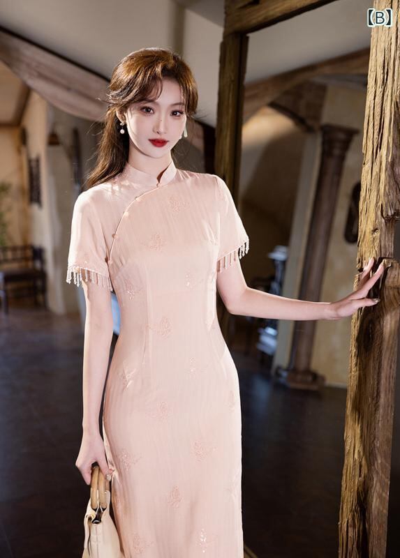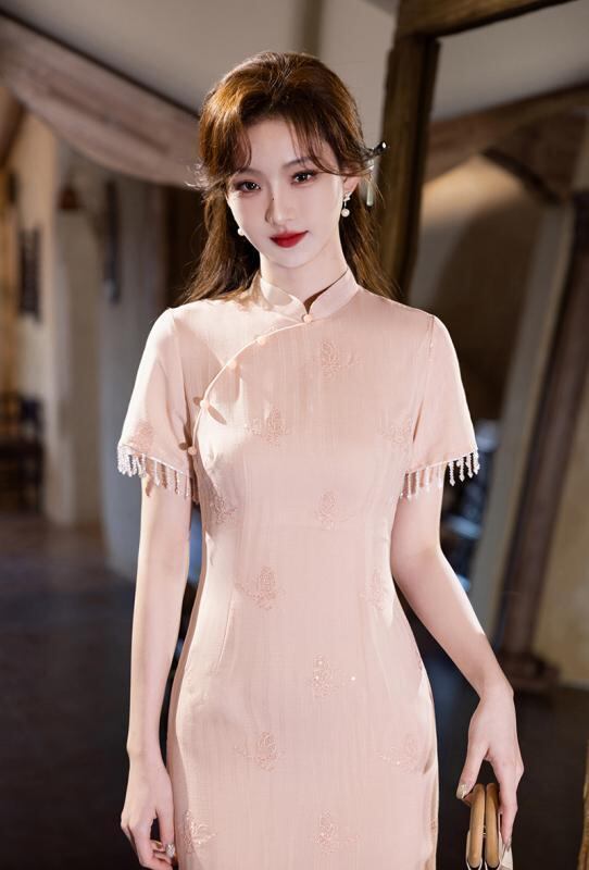 ワンピース レディース 新中華風 チャイナドレス エレガント ロング丈 レース切り替え スパンコール 蝶刺繍 スタンドカラー スリット入り ポリエステル レーヨン ストレッチ 春夏 レトロモダン フォーマルドレス