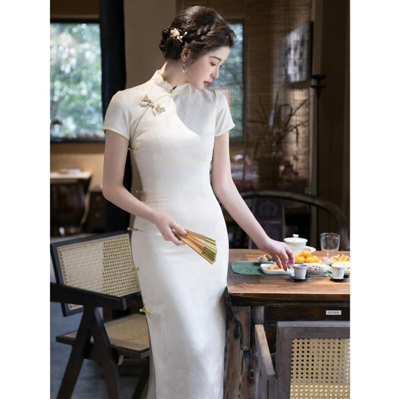 チャイナドレス レディース 女性用 高級感 エレガント レトロ 民国風 改良型 ロング丈 スタンドカラー 斜め襟 七分袖 スリット入り ポリエステル素材 デジタルプリント ホワイト 春夏