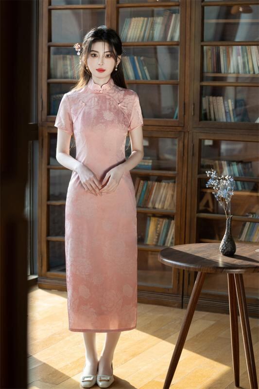 ワンピース レディース ピンク 高級感 改良 チャイナドレス 新中華風 ロング丈 スタンドカラー 3分袖 スリット入り レトロ 上品 エレガント 春夏