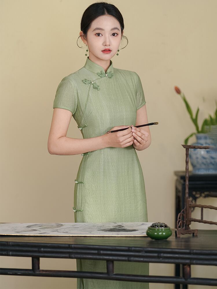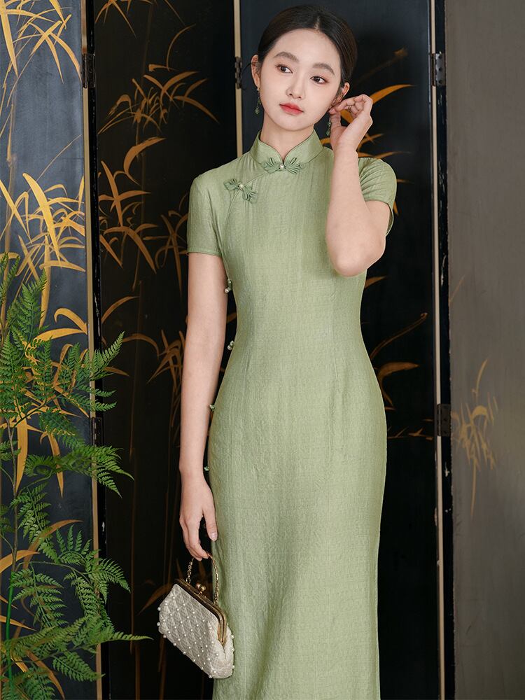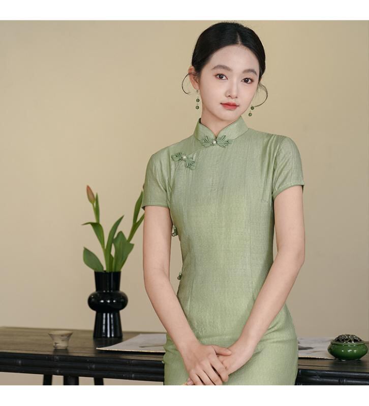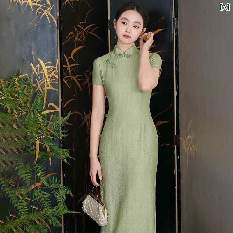 チャイナドレス ワンピース レディース ロング丈 マキシ丈 ポリエステル レーヨン混 シンプル エレガント 上品 モダン デイリーユース 普段使い 春夏 グリーン モスグリーン レトロ ヴィンテージ スタンドカラー