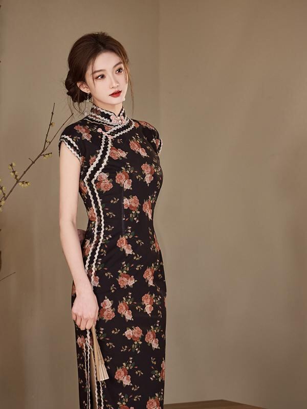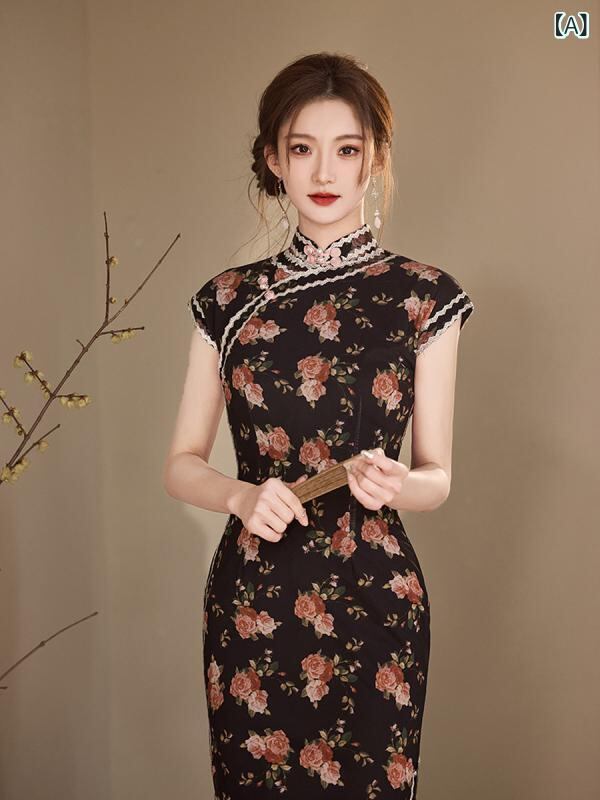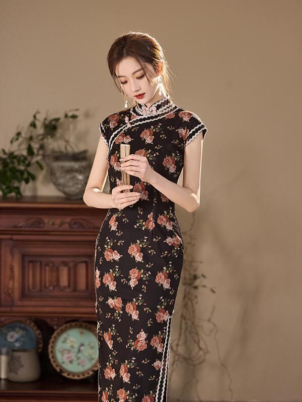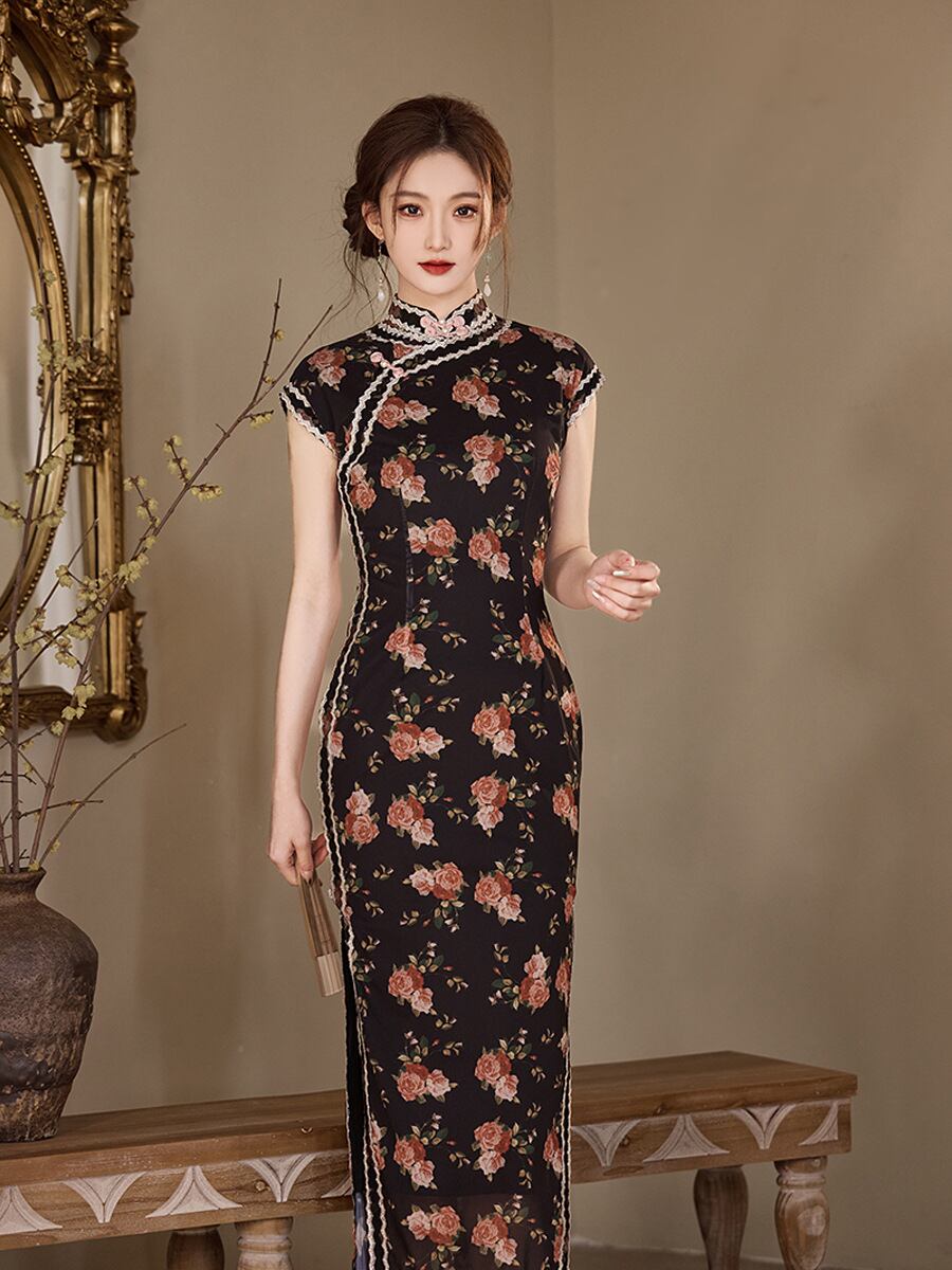 チャイナドレス レディース ローズ柄 華やか レトロ 民国風 気品あるエレガント ロング丈 斜め襟 スタンドカラー 微ストレッチ ポリエステル ブラック 春夏