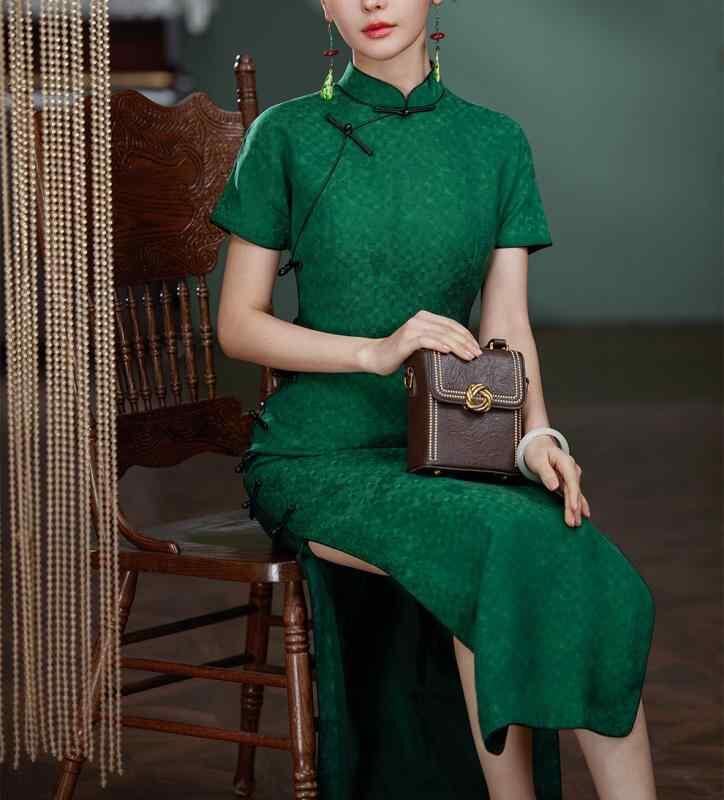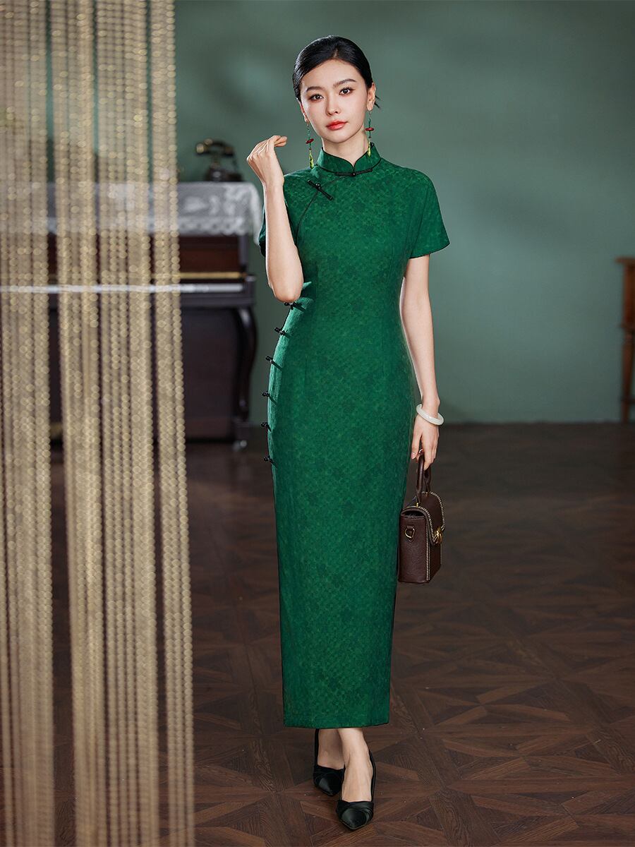 チャイナドレス レディース グリーン ジャカード織り ロング丈 上品 エレガント レトロモダン 中国風 普段使い パーティー 春夏 キュプラ テンセル 微ストレッチ