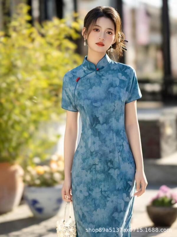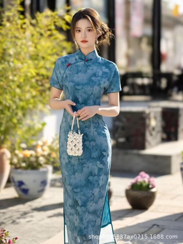チャイナドレス レディース フェミニン スタイリッシュ ブルー 新中式 国風 復古 エレガント ワンピース