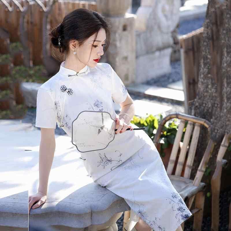 チャイナドレス レディース フェミニン スタイリッシュ 風 ワンピース 和風 ロング丈 新 レトロ 半袖 夏 ミドル丈 女性用