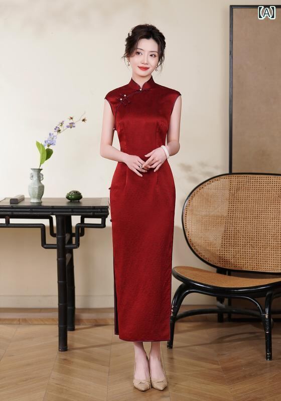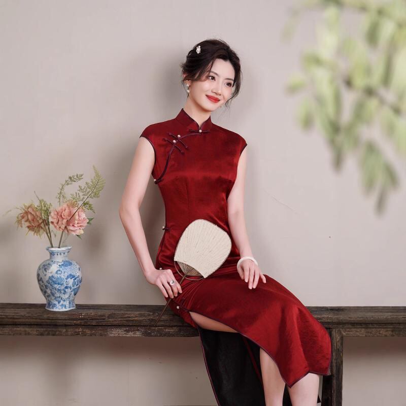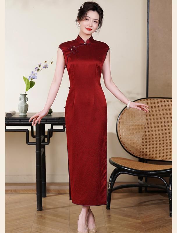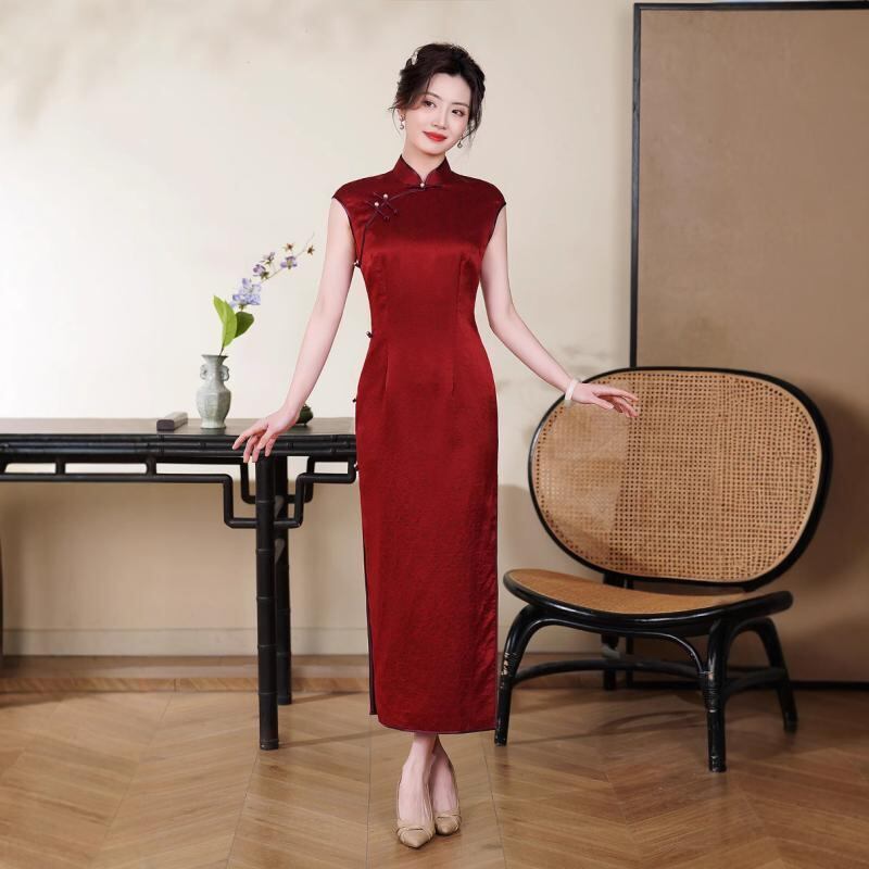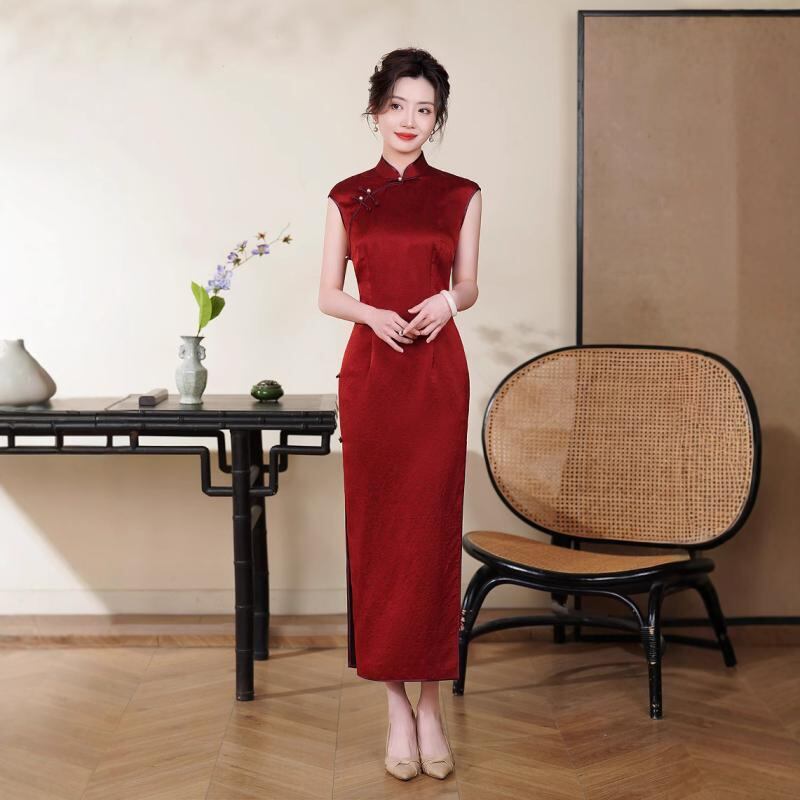 チャイナドレス レディース ロング丈 マキシ丈 桑蚕シルク 正絹 香雲紗 レトロ クラシカル 改良型 モダン スタンドカラー 斜め襟 ハイサイドスリット 中国風 春夏 エレガント おしゃれ