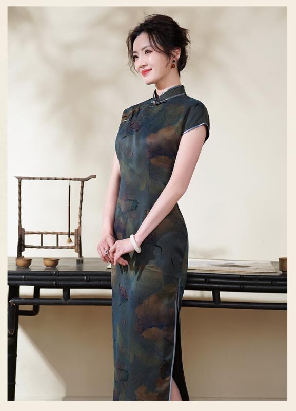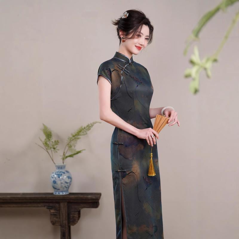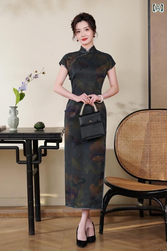 チャイナドレス レディース ロング丈 改良型 シルク 桑蚕絹 香雲紗 スタンドカラー 斜め襟 3分袖 ハイサイドスリット 微ストレッチ レトロ クラシカル ファッション 大人女性 春夏 パーティー イベント デジタルプリント