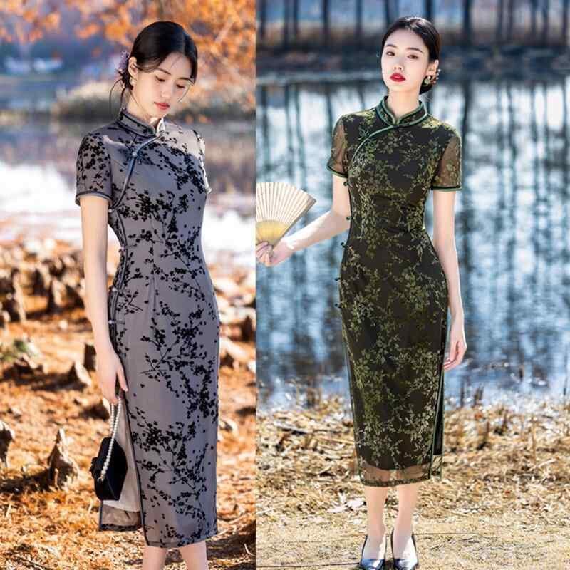 チャイナドレス レディース レトロ 中国風 植毛メッシュ 半袖 ロング丈 グリーン 立襟 斜め襟 3D立体柄 ポリエステル ポリウレタン エレガント 春夏