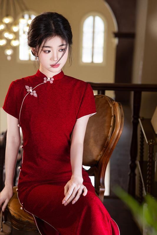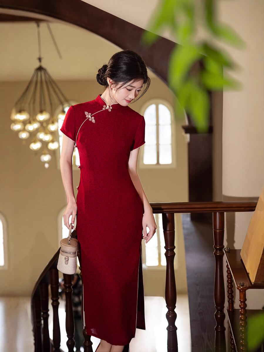 チャイナドレス レディース レッド 新中式 改良 レトロ モダン ロング丈 マキシ丈 高級感 エレガント お呼ばれ パーティー フォーマル 五分袖 スタンドカラー ジャカードサテン 微ストレッチ 春夏