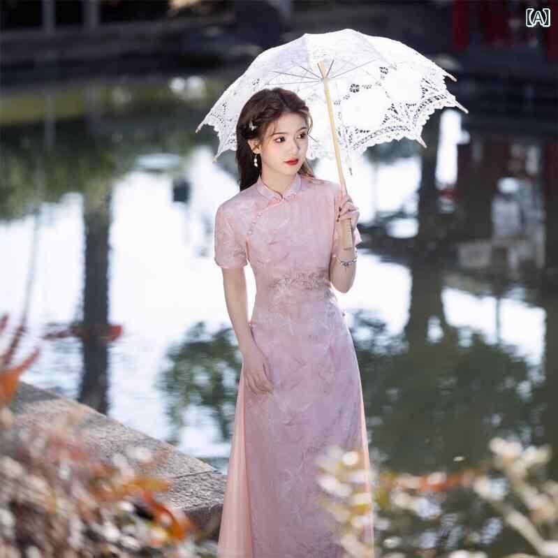 ワンピース レディース 女性 母親 アオザイ チャイナドレス 改良 スタンドカラー 斜め襟 七分袖 ロング丈 ポリエステル ストレッチ 普段使い カジュアル 春夏 ライトピンク