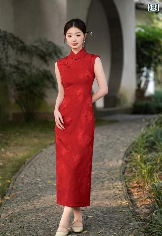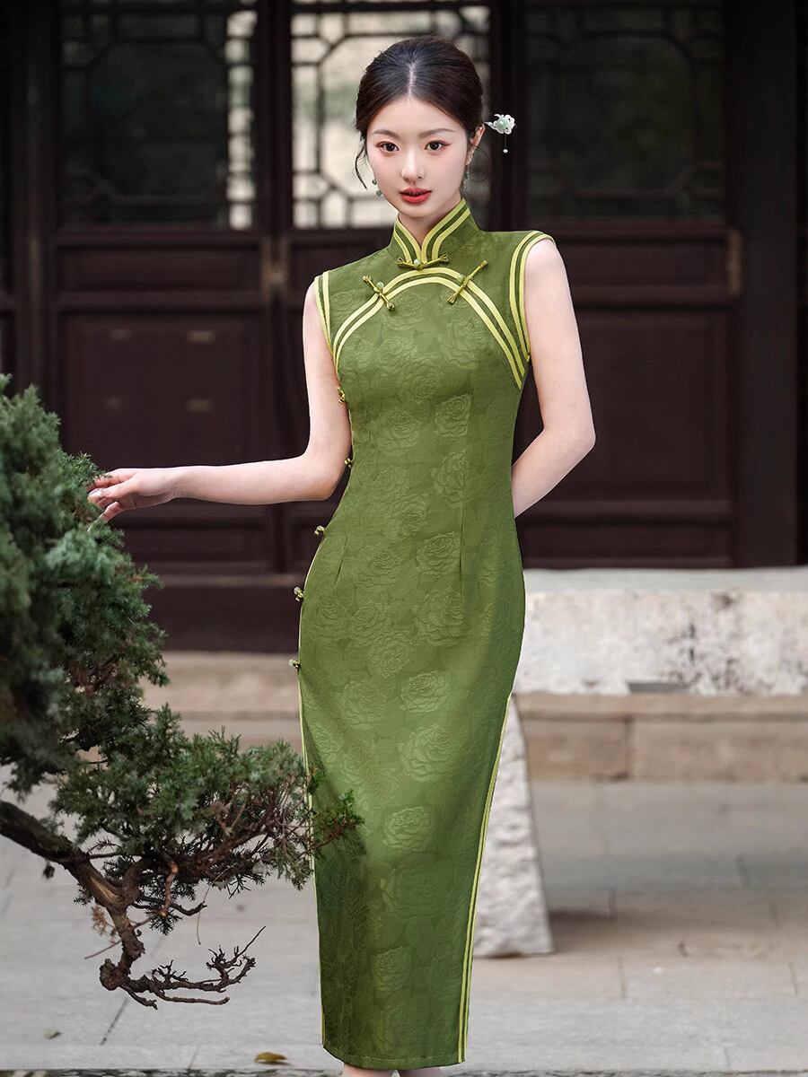 チャイナドレス レディース 春夏 ノースリーブ ブルー ジャガード織り ポリエステル製 新チャイナスタイル ロング丈 ハイネック スリット パイピング レトロ 中国風 普段使い 上品 エレガント