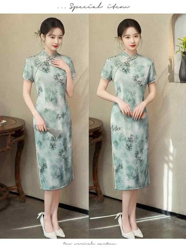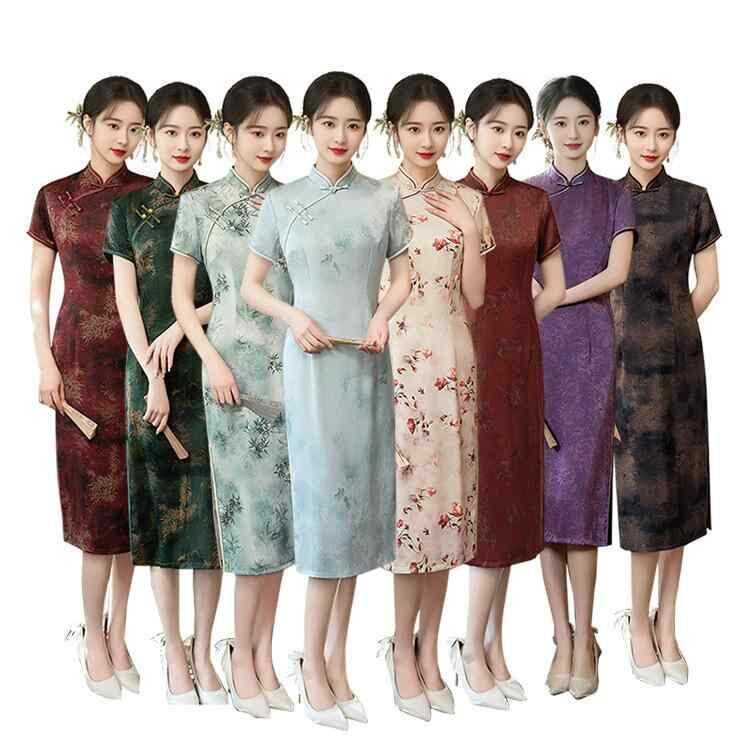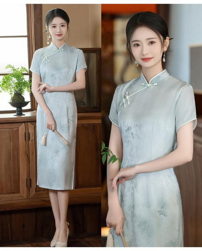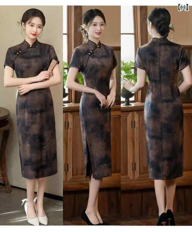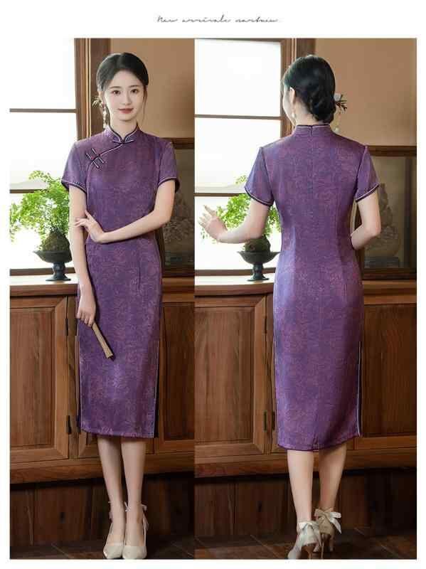 チャイナドレス レディース フェミニン スタイリッシュ 春夏 アセテート ジャカード織 半袖 レトロ 日常使い 普段着 ワンピース ミドル丈 着痩せ 体型カバー